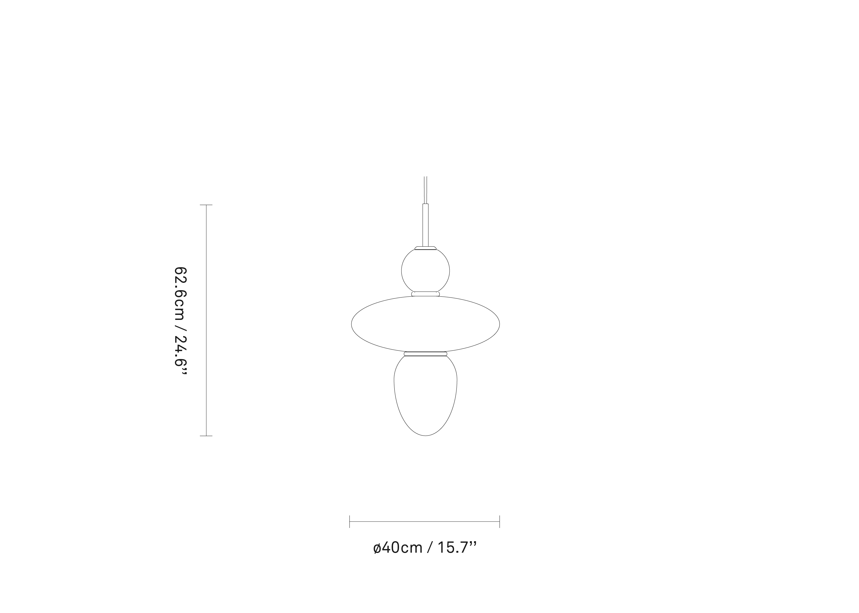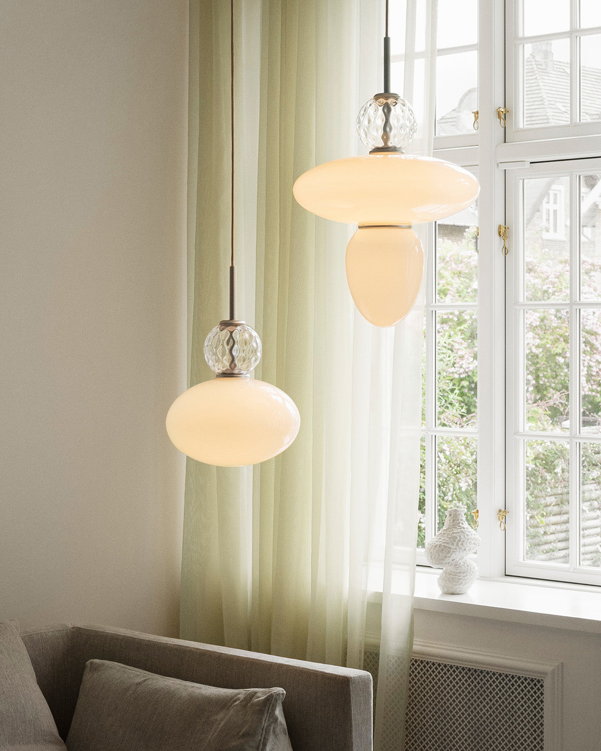 Rizzatto 43 pendlen har geometrisk formede skærme i en kombination af klart optisk glas og opalhvidt glas, der er monteret sammen. Pendlen er udsmykket med detaljer i satin sølv metalfinish, hvilket tilføjer en subtil kontrast til det mundblæste glas. Rizzatto 43 skaber behagelig og dekorativ kvalitetsbelysning over et spisebord eller en sofa, enten alene eller i grupper med andre Rizzatto-lamper.