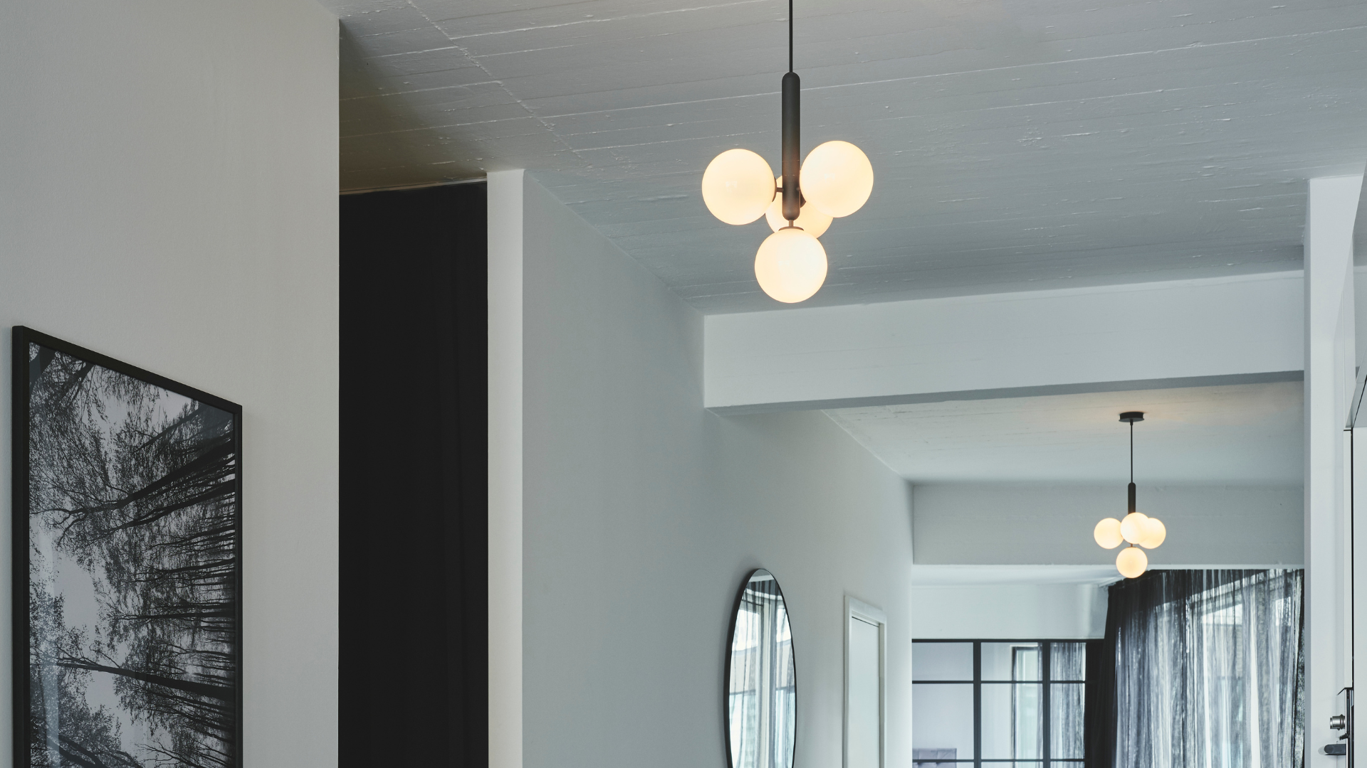 To carry the theme through, Da Costa Living chose to use Miira 4 Opal throughout most of the apartment, as repetition creates consistency and calm. The smaller Miira 4 Opal has a graphic look and innovative shape, spreading a comfortable light through its opal white, hand-blown glass. In the bedroom, Blossi Table Black act as bedside lights and can be dimmed to suit the mood or requirement. Above the dining table hangs the stunning Apiales 18 Brushed Brass, providing its atmospheric light for the many moments of 'hygge' between friends and family.