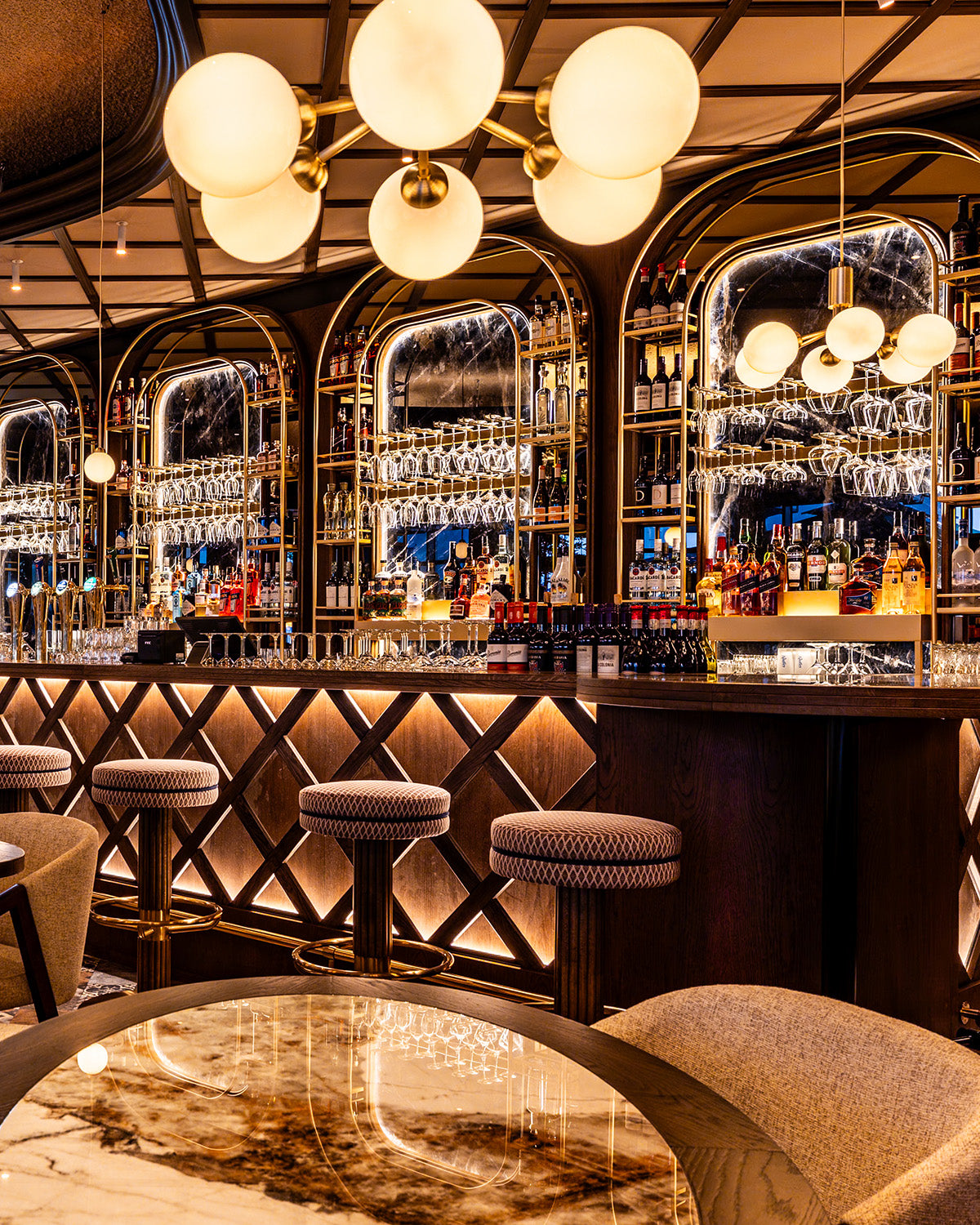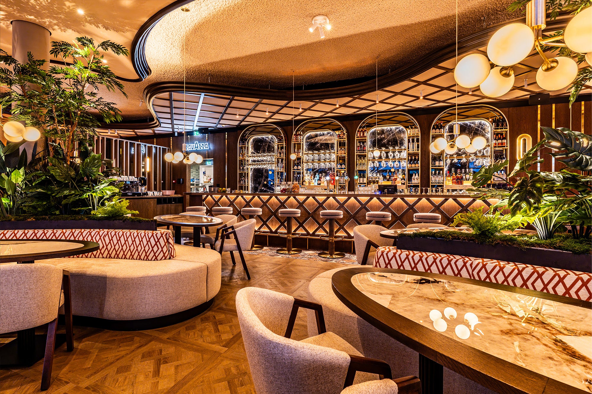 Carefully layered pendants and wall-mounted lighting provide soft, ambient illumination, highlighting key materials and defining intimate dining zones without overwhelming the space. The lighting adapts throughout the day, from bright and