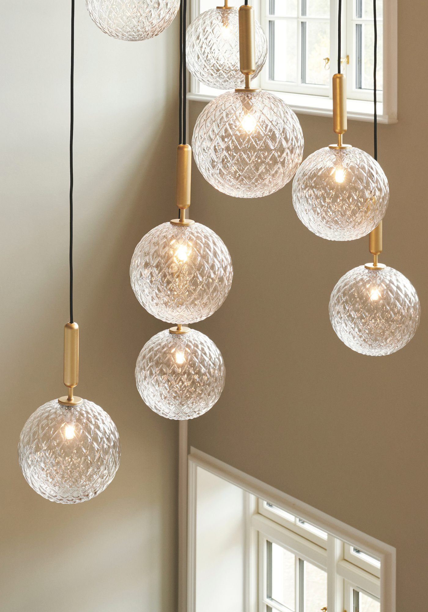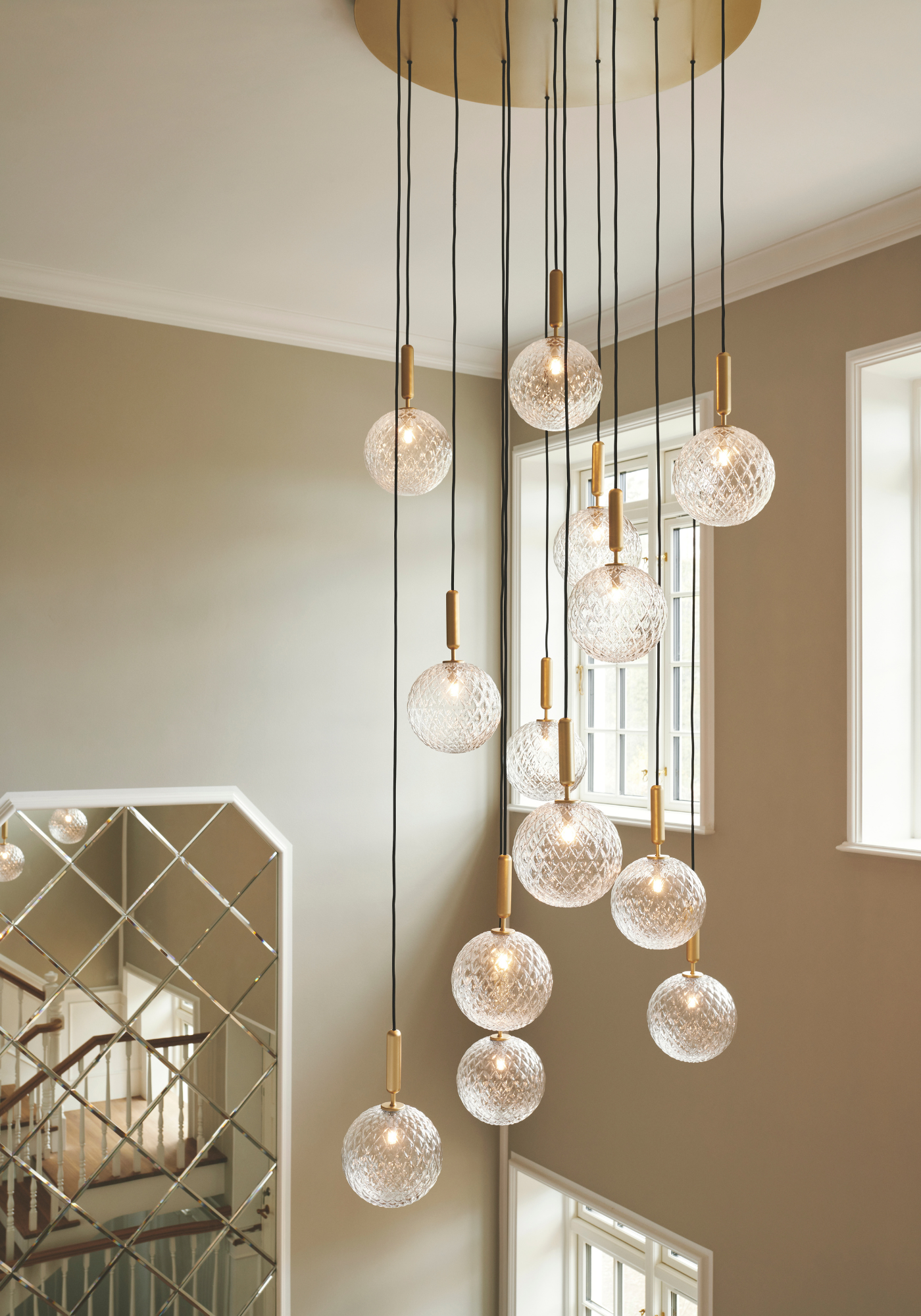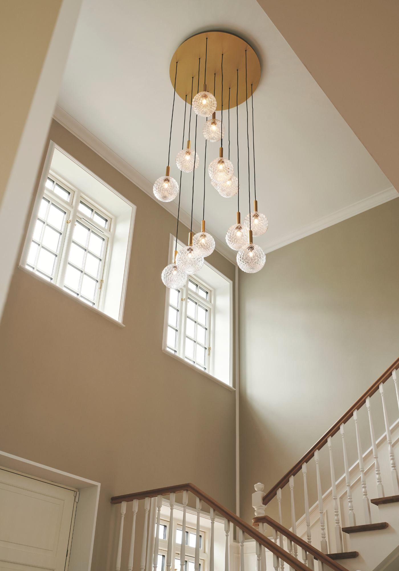 Developed through Nuura bespoke, the installation is carefully composed to enhance the verticality of the room, allowing the optic glass spheres to cascade elegantly and create a refined, luminous statement.