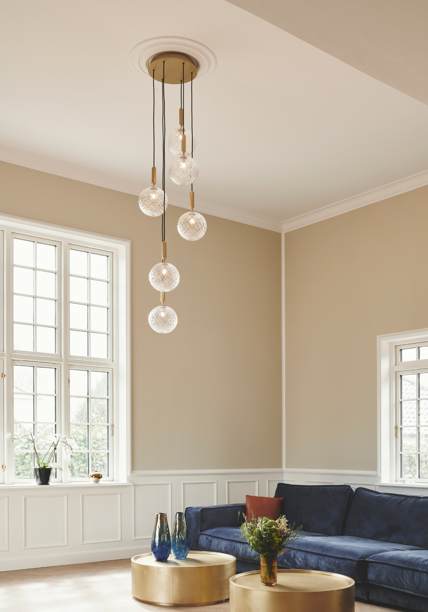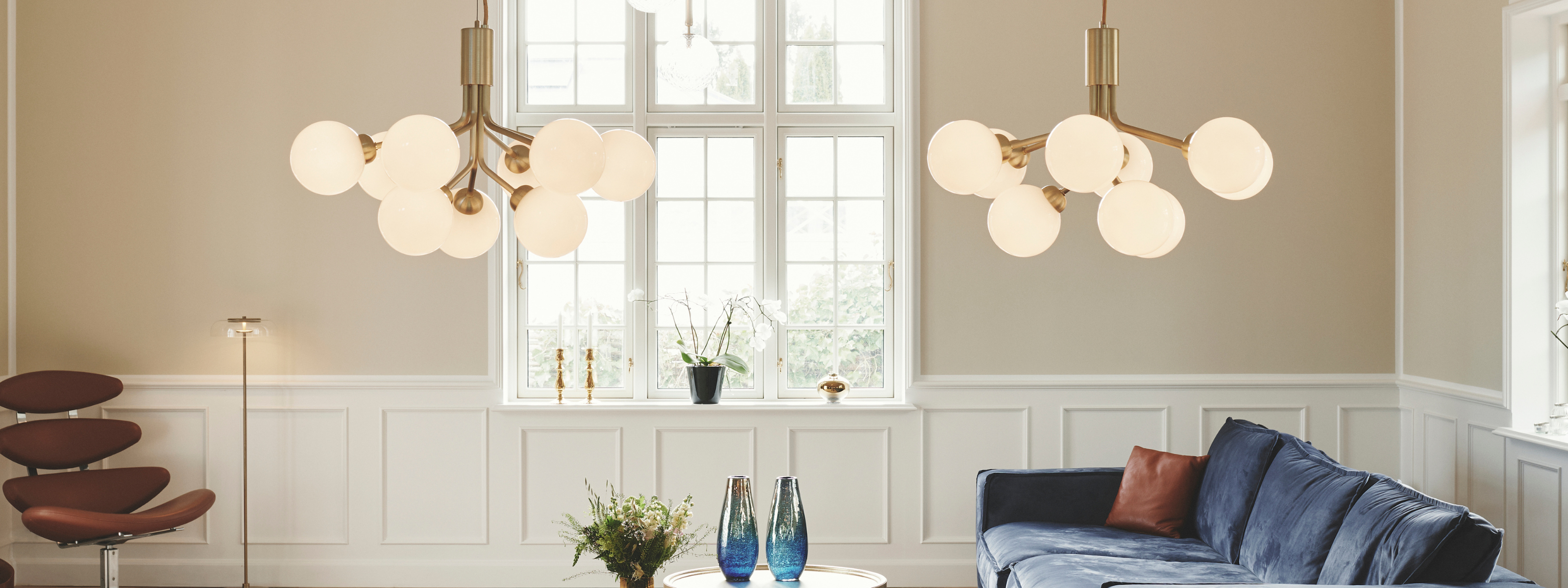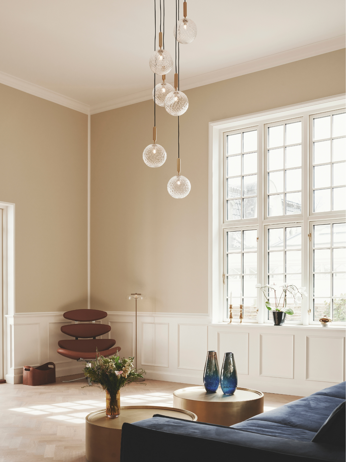 In the living room, Miira 6 Large in brass / optic introduces clarity and brilliance, the optic glass spheres reflecting the daylight beautifully.