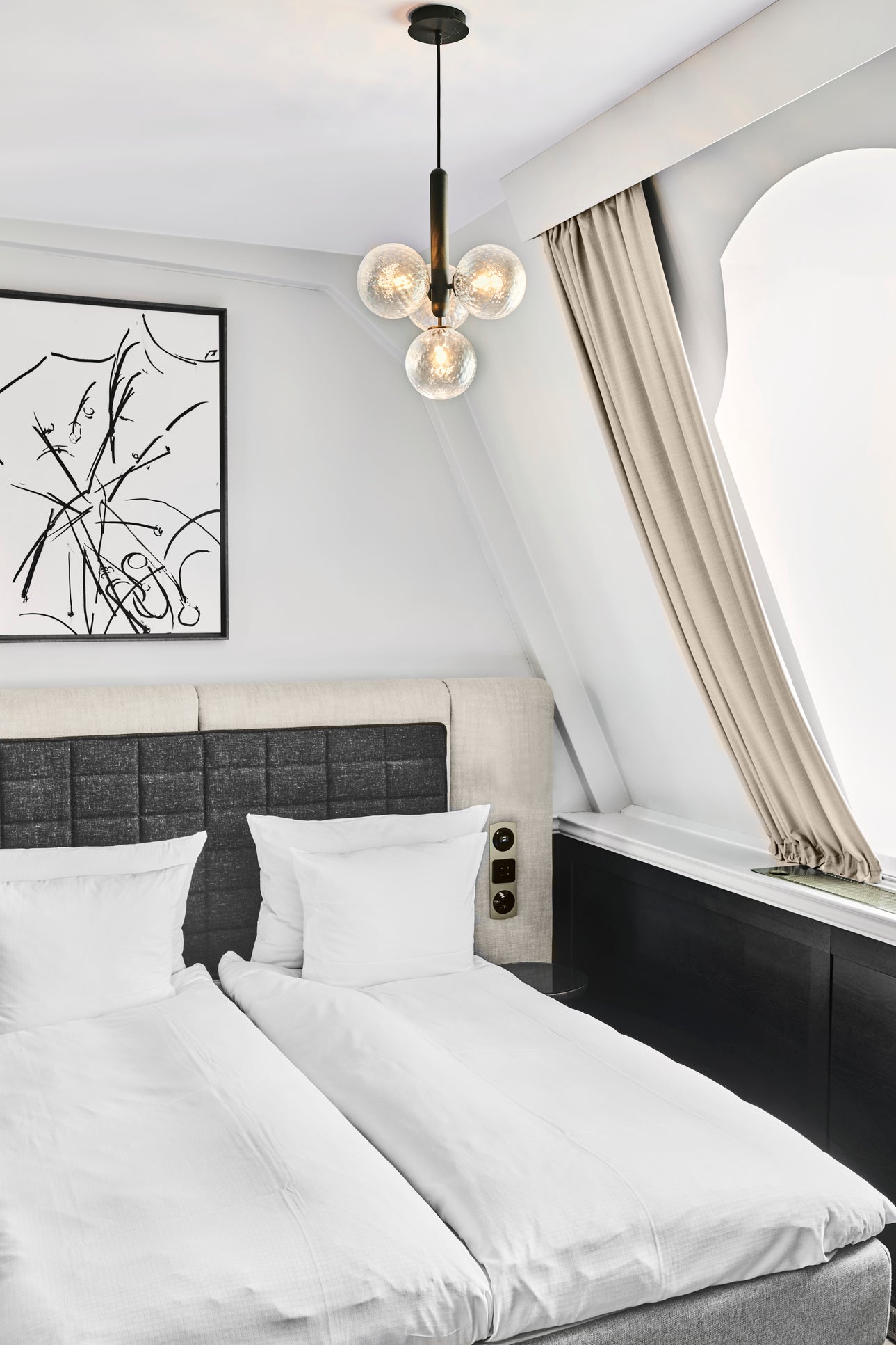 Our Miira chandeliers are placed in all rooms on the 3rd floor and constitute a link between the past and the present. They spread quality, sensuous lighting and complete the decor. Miira 4 with optic clear glass offers decorative lighting with clear references to historic chandeliers.