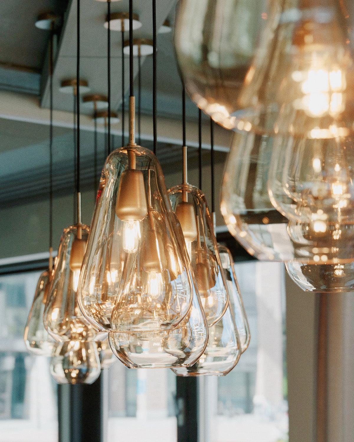 The drop shaped Anoli 1 Medium pendant is inspired by a peaceful, snow-covered winter landscape, represented in the soft, organic shape of this lamp design. The mouth-blown opal white glass enhances the clean lines and is complemented by details in golden metal and a white fabric covered cable.