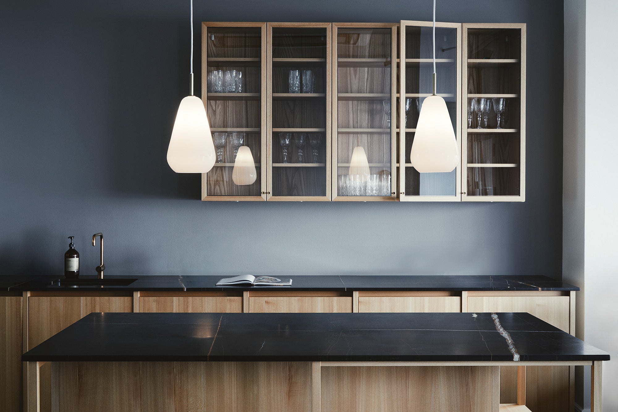 Anoli 13 is a large chandelier with 13 drop-shaped cluster pendants. Made of opal white glass, the chandelier evokes associations with freshly fallen snow. The glossy white glass highlights the clean lines of the teardrop shape and is supported by details in golden metal. The pendants are suspended in a white fabric cord from a large ceiling plate, forming the cluster formation. With its bold, voluminous design, Anoli 13 is best suited in larger rooms with a high or sloping ceiling. The ceiling plate can be mounted on open ceilings as well, and the cluster can be arranged in different formations.