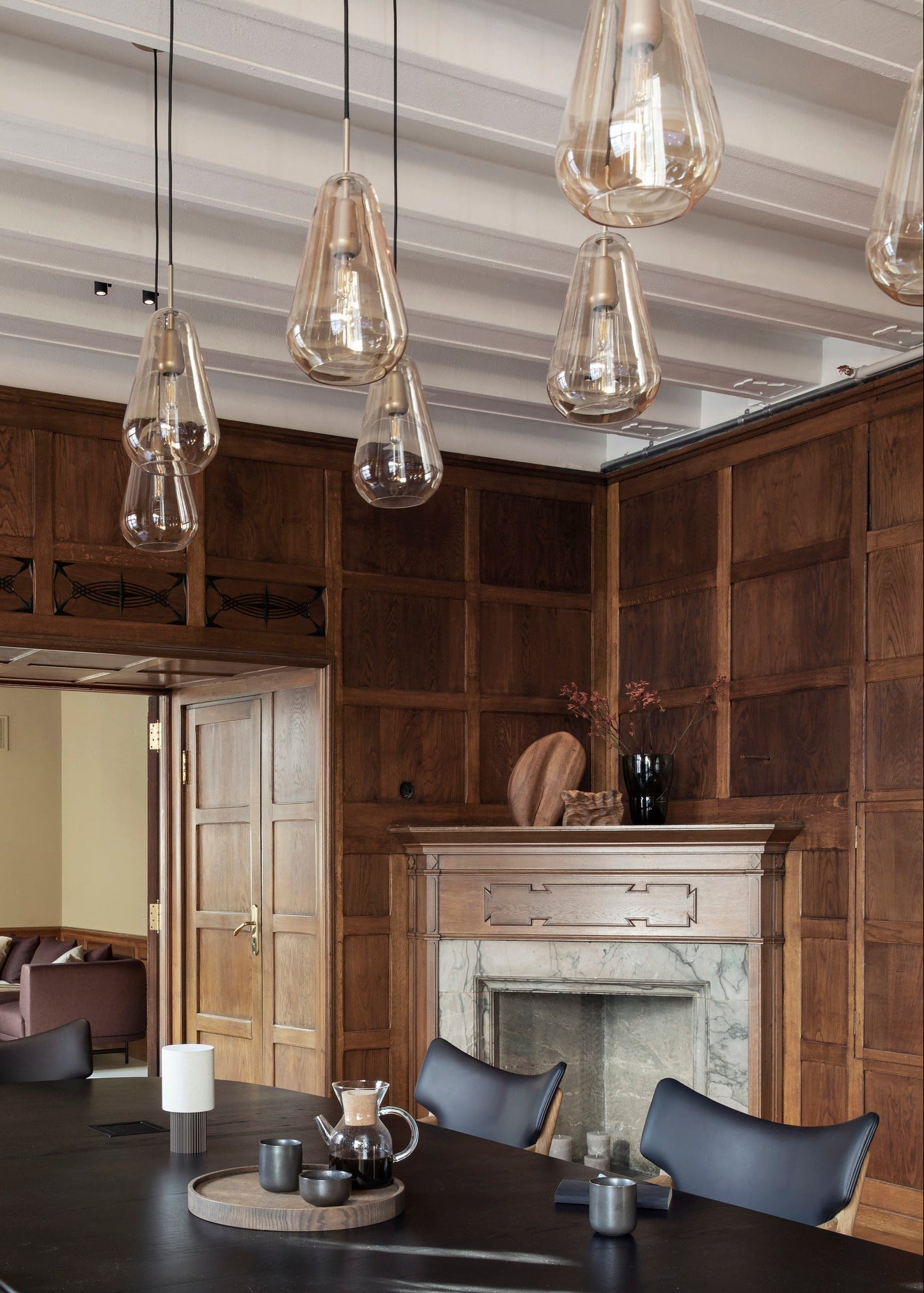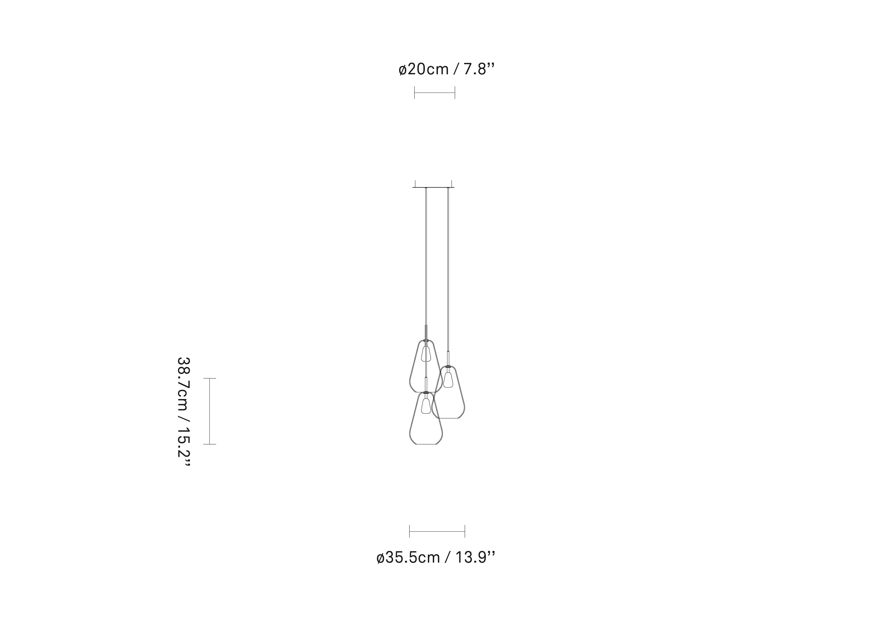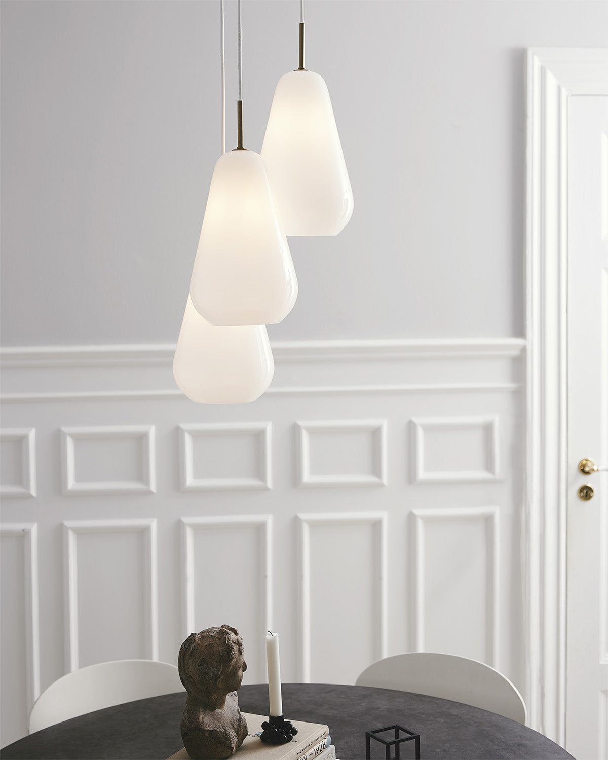 Anoli 3 consists of three hand-blown glass pendants in opal white glass, gathered in a cluster of light. The drop-shaped shades reflect the soft lines of nature, and the white glass suggests a snowy landscape. The cluster pendant is made with details in gold, where the warm, metallic finish adds a subtle glow and ties the design together. The combination of the two materials makes Anoli 3 both timeless and modern. Anoli 3 is ideal as lighting above a round dining table or in the entrance hall, where the lamp casts a soft, diffused light over the many tasks of everyday life. The lamp can be installed in different cluster formations depending on size and space of the room.