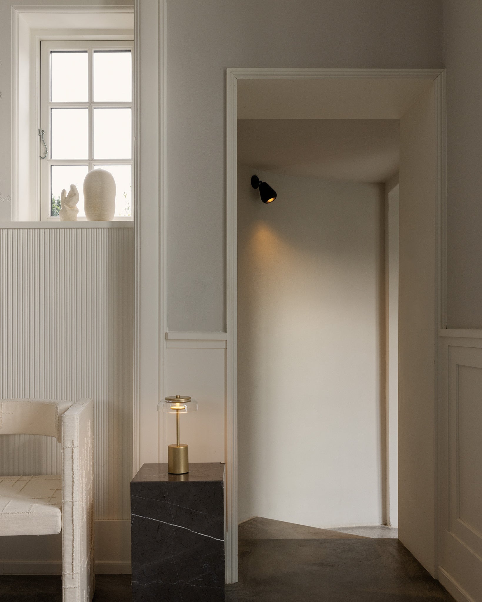 Anoli Spot Recessed is a hardwired, built-in spot that provides a complete and seamless finish to any room. The custom-made black metal shade is gently placed on an adjustable arm and draws references to a raindrop’s soft silhouette.