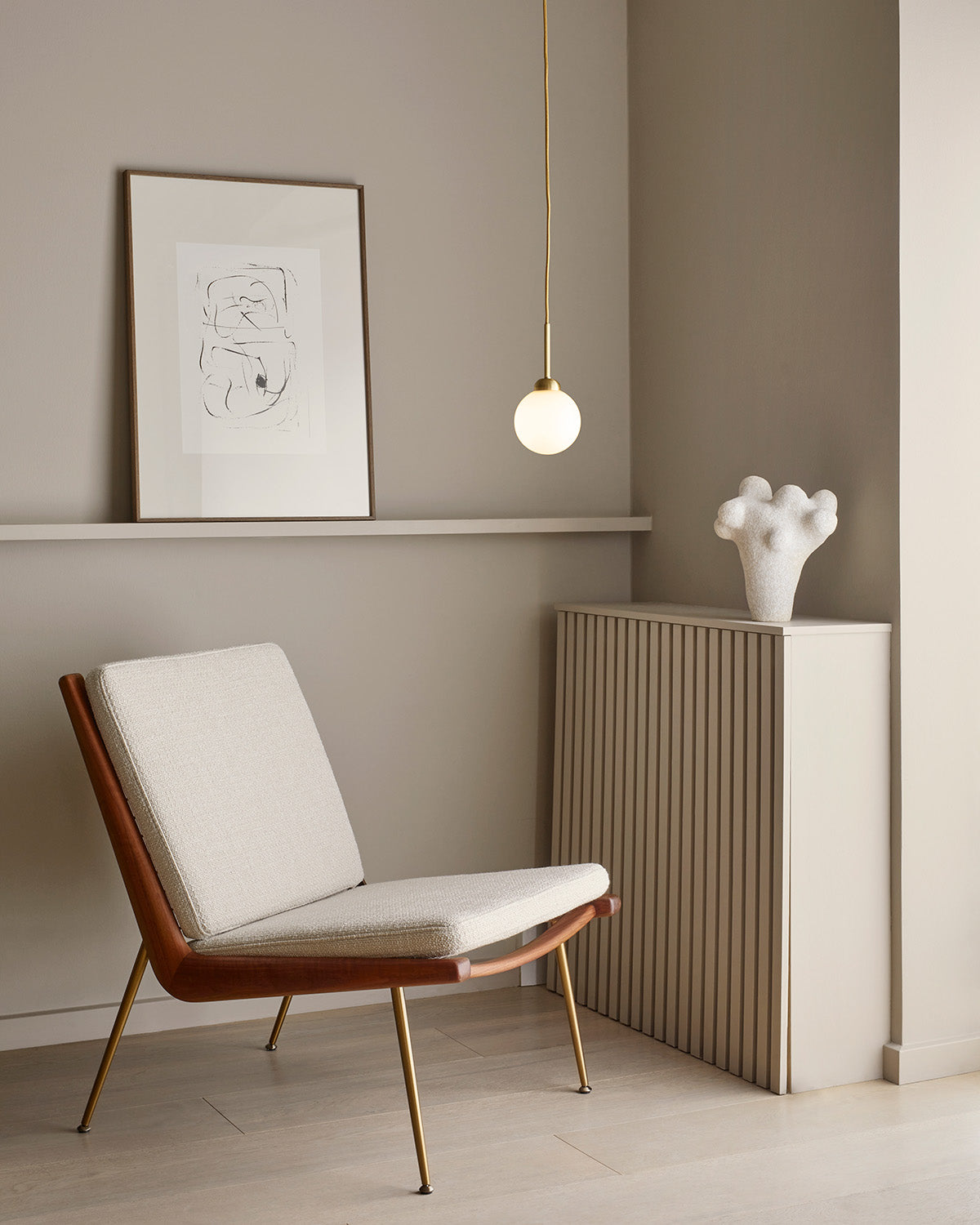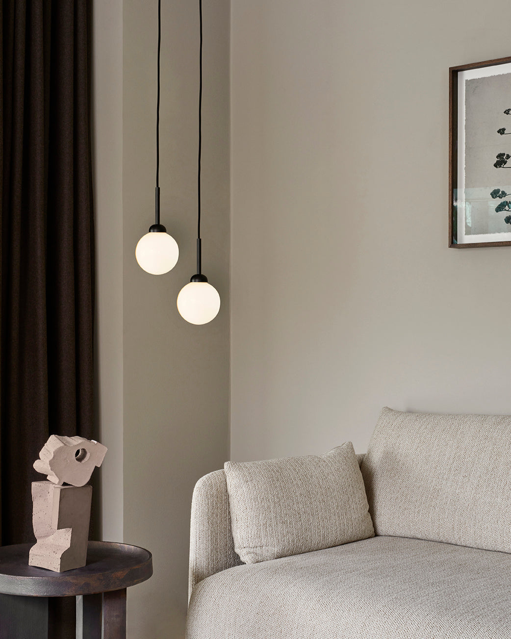 Apiales 1 is a simple pendant lamp with a classic look that provides good light without taking up much space. The pendant lamp hangs from a gold fabric-covered cord, and a slim metal suspension in brushed brass carries the mouth-blown glass shade. The opal white glass spreads a pleasant light, and the golden details add a warm touch to the interior.