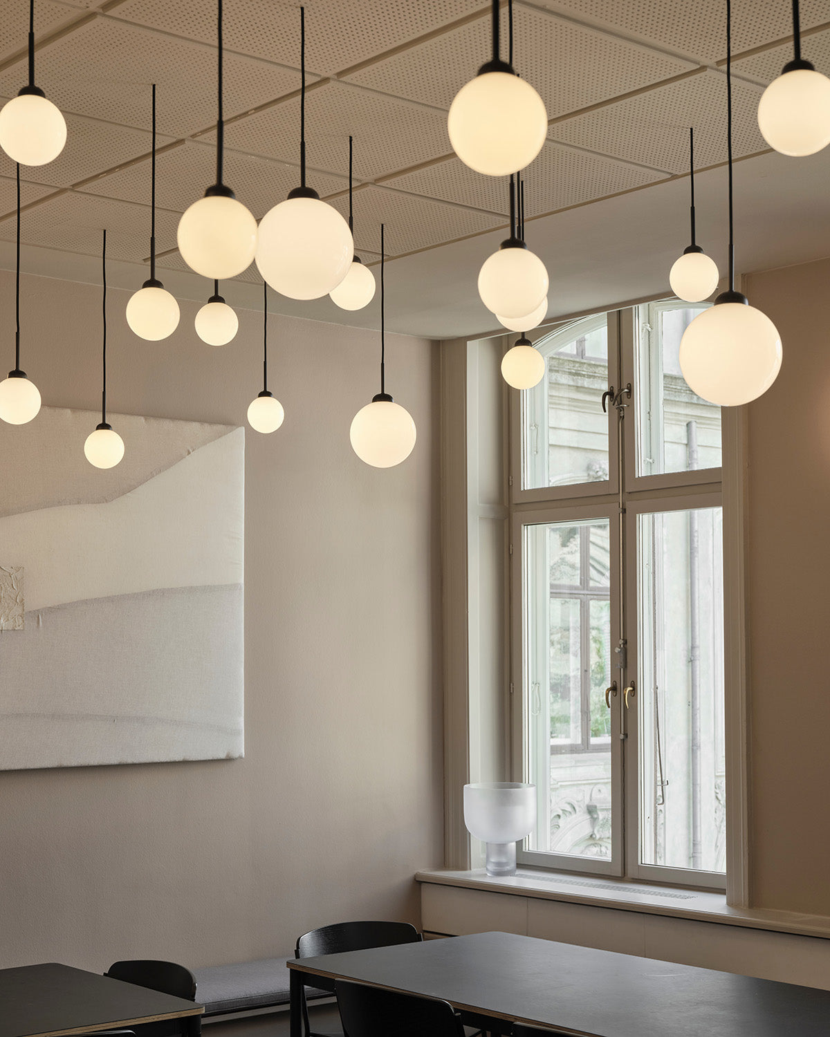 Apiales 1 Large is a larger version of the Apiales 1 pendant. The large opal white glass shade stands in stark contrast to the slim metal suspension in satin black, which gives a modern and timeless design expression. The pendant emits a pleasant, diffused light. The pendant is versatile and suits different rooms and settings. With its simple design, Apiales 1 Large is suitable both as a stand-alone lamp or several mounted in a row for uniform lighting.