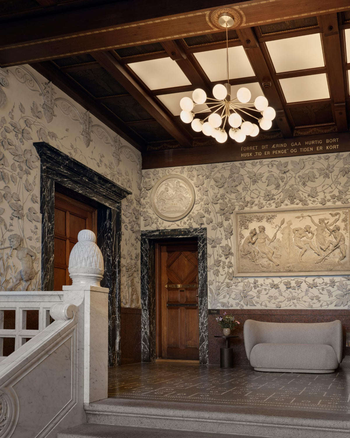Apiales 18 is the biggest chandelier in the Apiales collection. The chandelier spreads a warm and inviting light from the mouth-blown glass globes that are held by a specially produced metal canopy and arms.