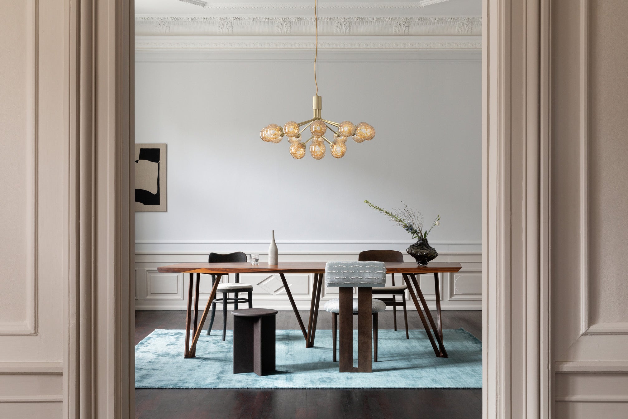 Apiales 18 is a modern reinterpretation of the chandelier with references to Nordic nature. Inspired by umbellifer flowers, the brushed brass metal arms unfold like flower stalks from which light is spread with grace through the optic gold glass globes.