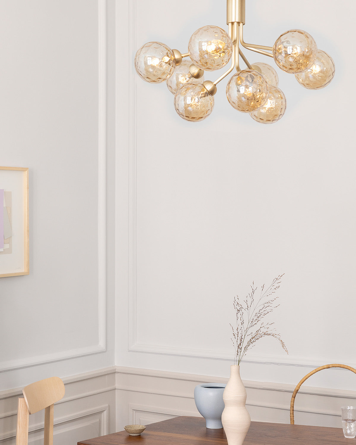 Apiales 9 is a modern interpretation of the chandelier. Inspired by umbellifer flowers, the Apiales chandelier unfolds 9 arms in brushed brass finish from a custom-made metal stem. The branched metal arms are capped with optic gold glass globes decorated with a soft, diced pattern on the inside, creating a warm glow with references to the golden hour. Apiales 9 is highly relevant in settings such as the living room above a sofa, or the dining room above a table.