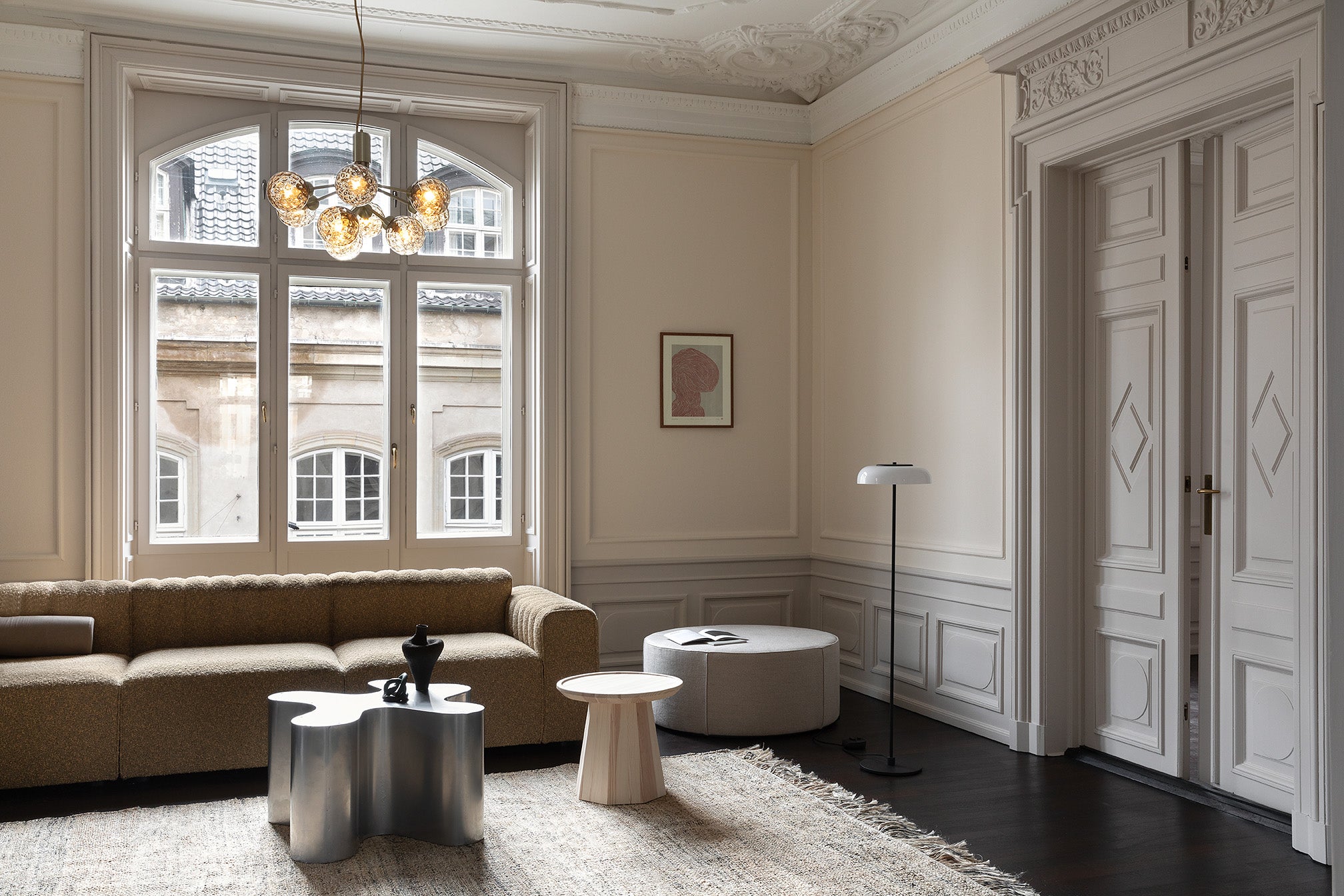 Apiales 9 is a modern interpretation of the chandelier. Inspired by umbellifer flowers, the Apiales chandelier unfolds 9 arms in brushed brass finish from a custom-made metal stem. The branched metal arms are capped with optic gold glass globes decorated with a soft, diced pattern on the inside, creating a warm glow with references to the golden hour.