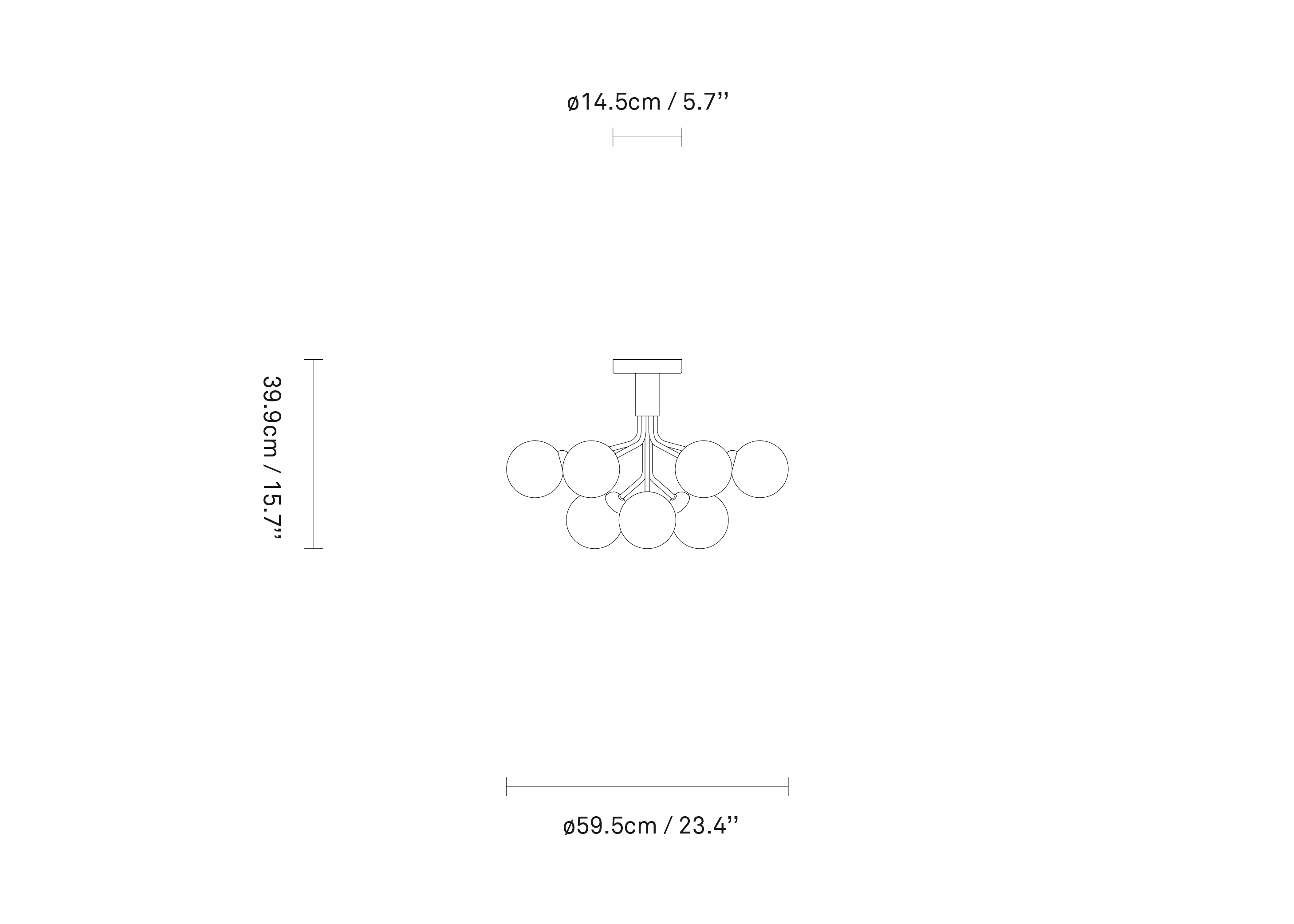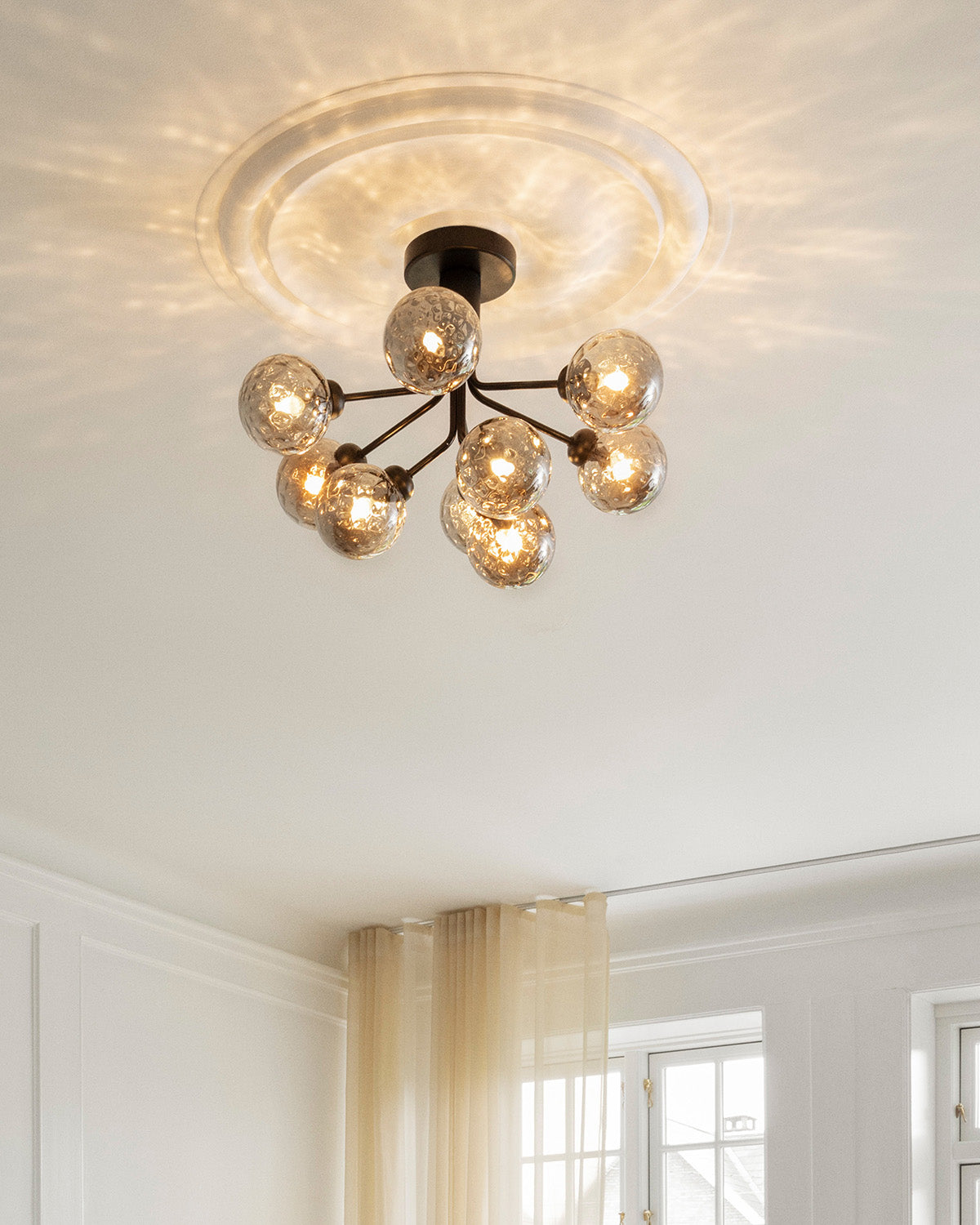 Apiales 9 Ceiling is a chandelier to be mounted directly to the ceiling. The ceiling lamp has a height of just 40 cm, which gives Apiales 9 Ceiling a great flexibility and makes it possible to hang a chandelier in rooms with lower ceilings. The design is inspired by flowers and consists of a specially produced canopy from where sleek metal tubes unfold like flower stalks in a satin black finish. The optic smoked glass globes are adorned with a diced pattern inside, creating a cosmic play of light in the room.