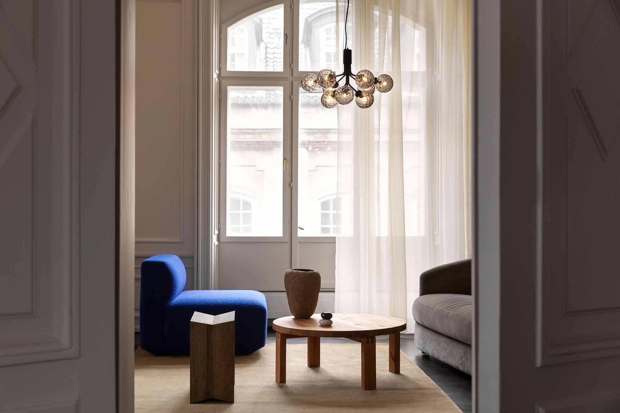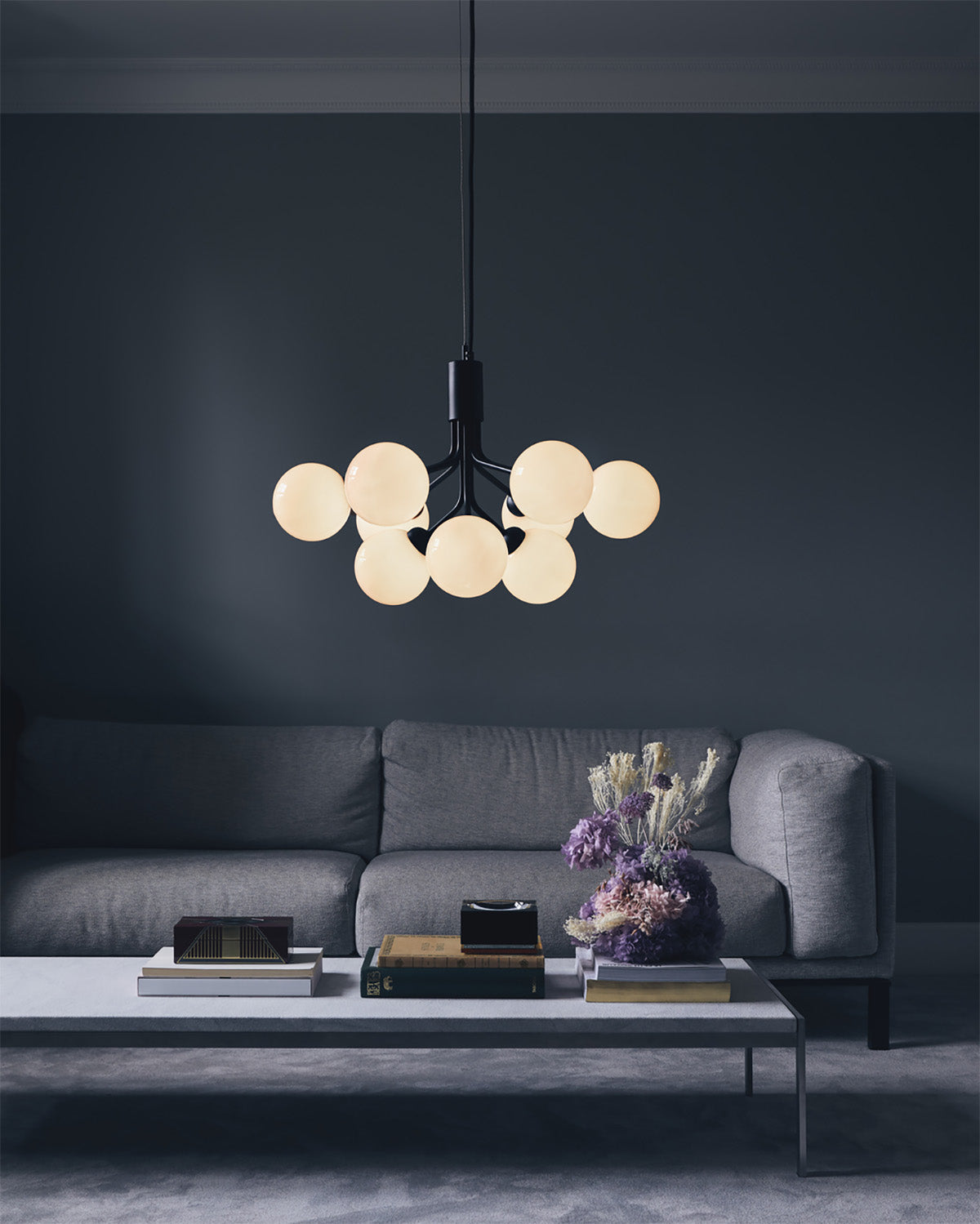 With inspiration from flowers, Sofie Refer has designed the Apiales collection. The collection consists of two chandeliers with 9 or 18 mouth-blown glass globes and is available in golden Brushed Brass finish or the smooth Satin Black. From a specially-produced canopy, the arms unfold like flower stalks from which light is spread with grace. Apiales 9, with its 60 cm in diameter, fits over the dining table, in the bedroom, or in the hall. Ceiling plate included.