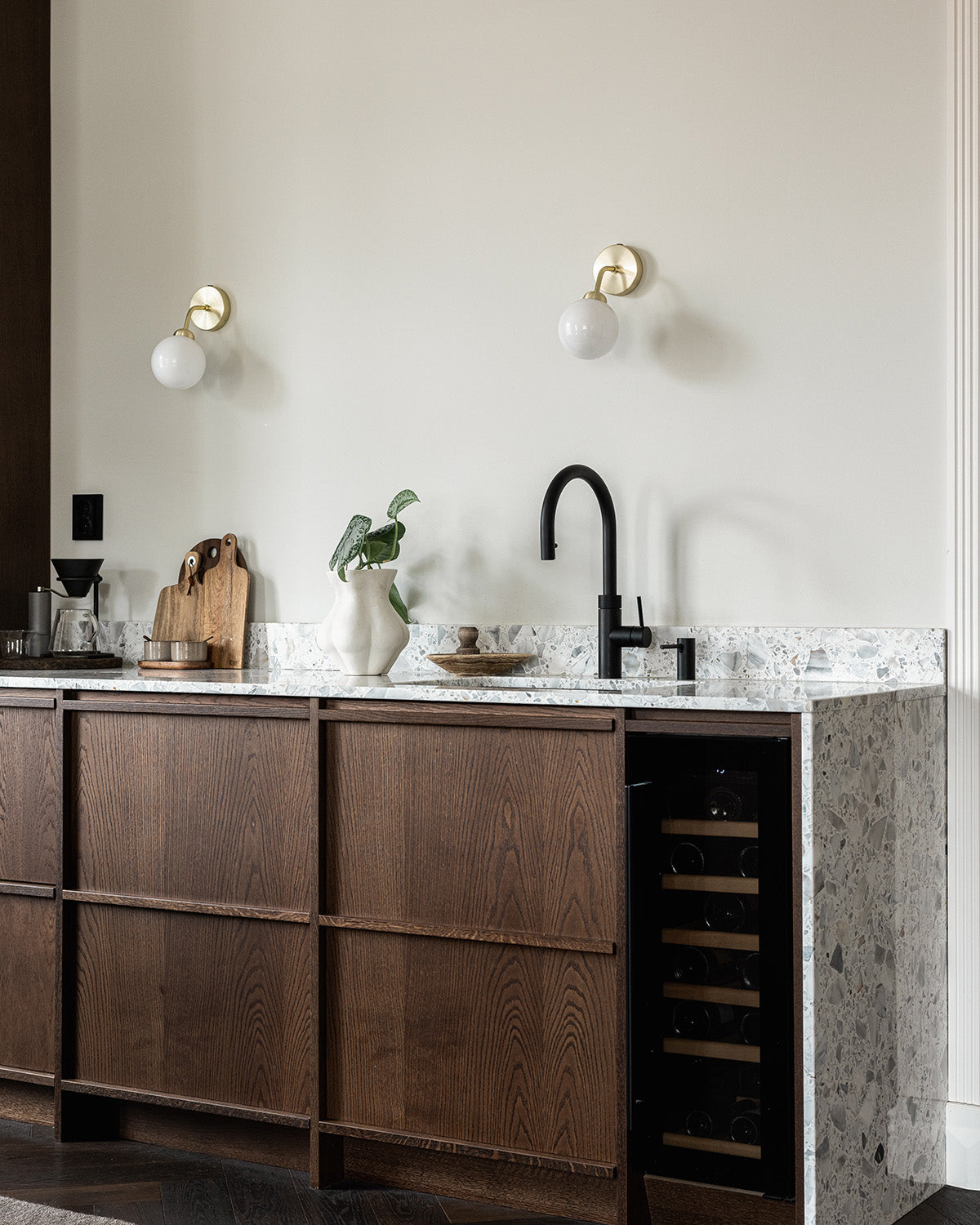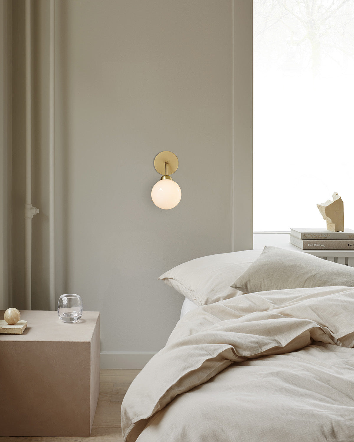 Apiales Wall is a timeless wall lamp that combines classic design and functionality with its simple design language and good lighting. The metal arm in brushed brass creates a golden base for the opal glass globe from where a soft and inviting light spread. Apiales Wall has no visible screws and is ideal in rooms where functional task lighting is needed. Place Apiales Wall in the kitchen where you chop vegetables and read recipes and enjoy a well-lit kitchen experience.