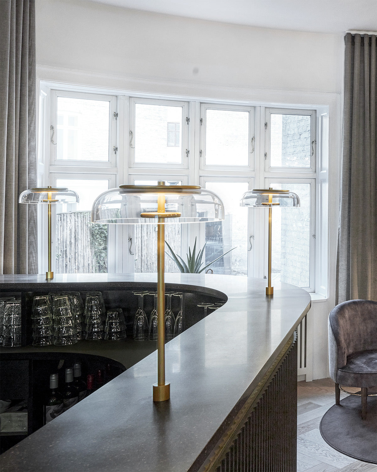 Blossi Table In-set Small is a surface mounted table lamp. The small in-set table lamp is powder-coated in a nordic gold finish and with a clear mouth-blown glass. A replaceable LED module is located in the rounded glass screen, from which a soft, indirect light is spread. The Blossi collection is produced with an easily replaceable LED card, offering a flicker-free light and meeting the latest EU lighting energy efficiency regulation. Cable with dimmer and EU + UK plug.