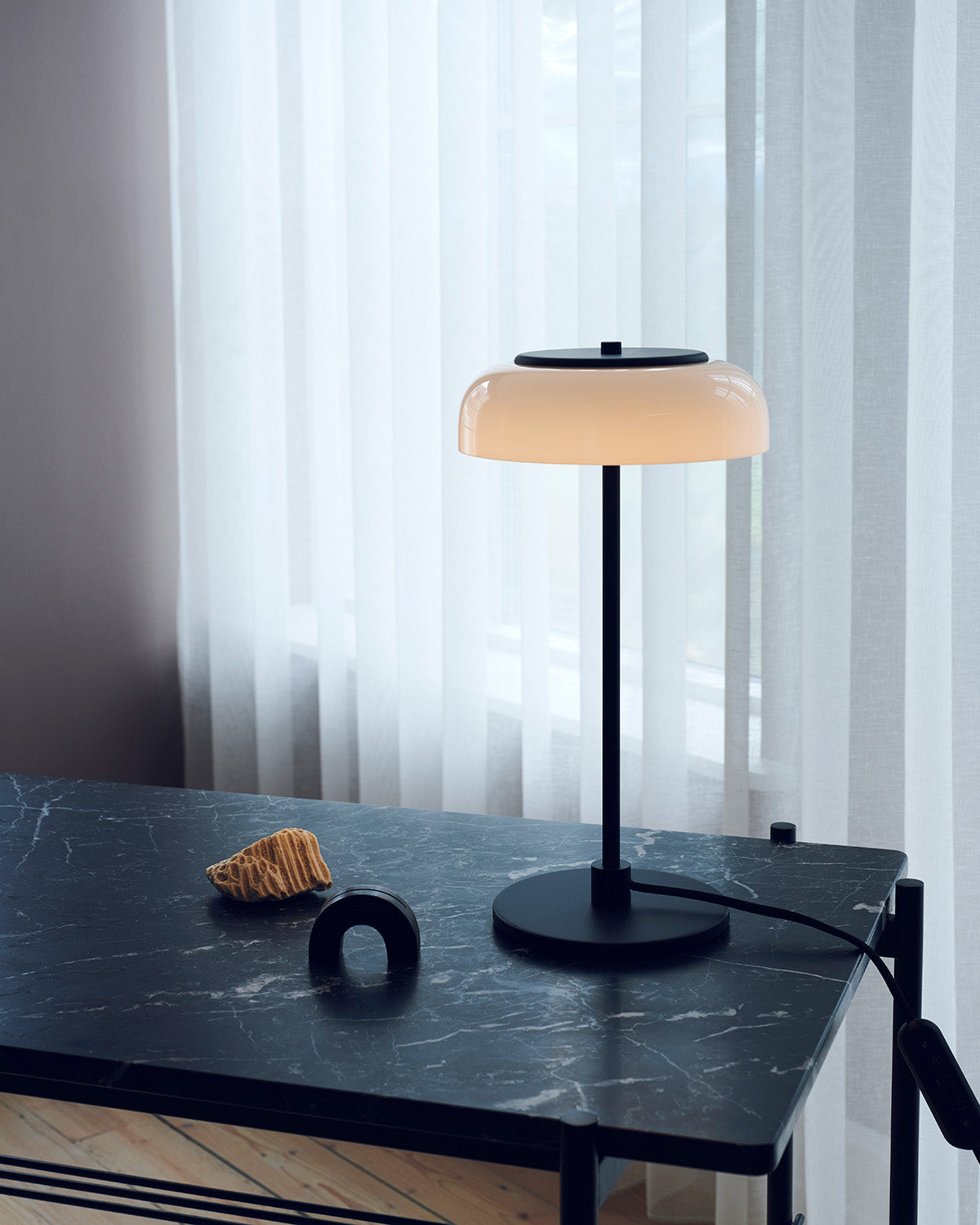 Blossi Table is a table lamp with an opal glass shade set on a black metal foot in satin smooth finish, resulting in an innovative yet timeless design. The table lamp is designed with a special developed LED disc which reflects the light softly in the mouth-blown glass shade. Place Blossi Table on the desk in an office or on a side table in the living room, and let the soft light illuminate the immediate surroundings. Cable with dimmer and EU + UK plug.