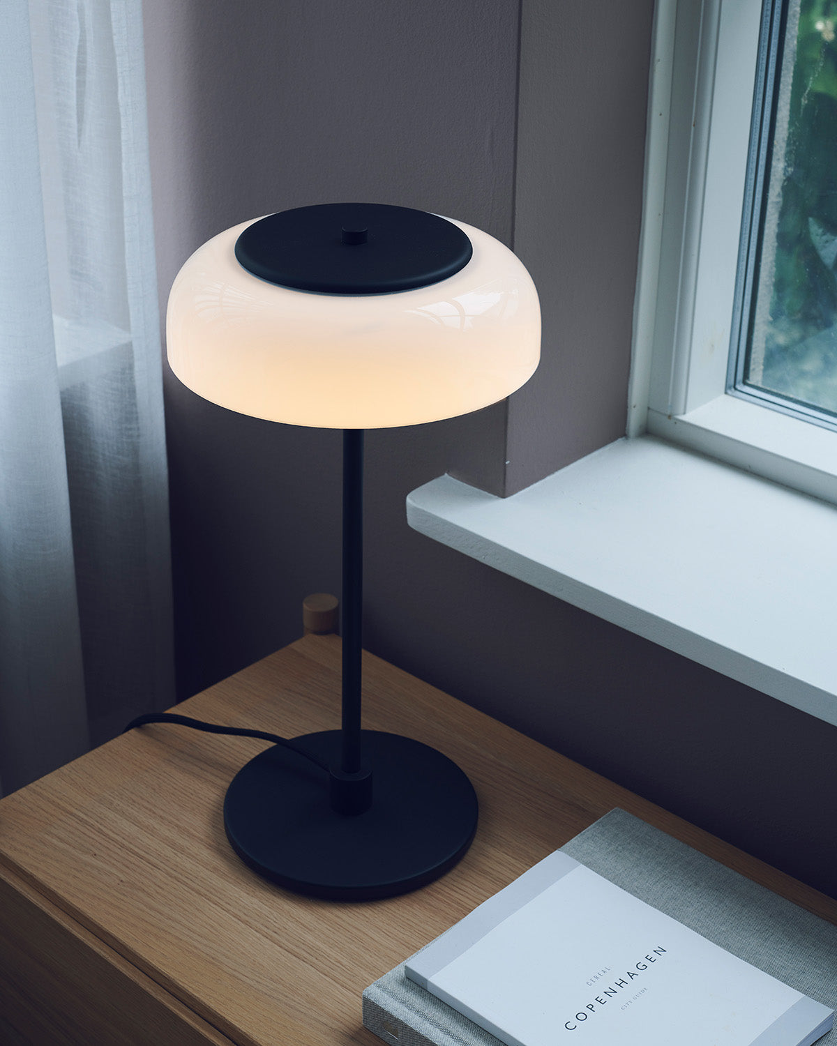 Blossi Table Small is a smaller version of the original Nuura Blossi table lamp. The simple opal white glass shade offers a stylish contrast to the sleek metal foot in black finish, creating a classic and timeless expression. A replaceable LED module is placed in the top of the shade and reflects the light into a metal disc, creating a soft, comfortable, and indirect light. The dimensions and expression of the lamp allow for additional light and atmosphere in the home where Blossi Table Small is placed. Cable with dimmer and EU + UK plug.