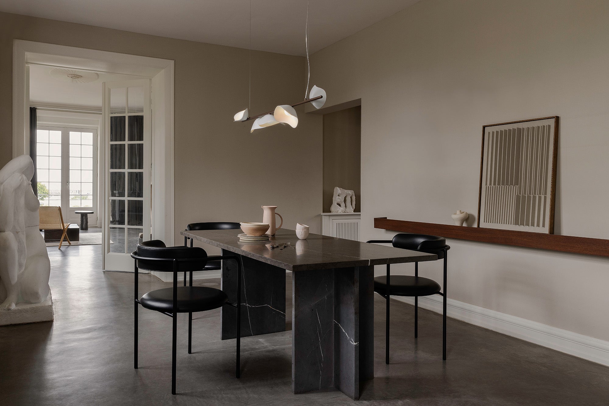 Florii 5 Linear is an elegant centrepiece that redefines the modern chandelier and is ideal in rooms where an oblong suspension lamp is desired. The integrated LED technology delivers efficient and long-lasting illumination that can be easily replaced without the need for tools. The dark bronze linear rod creates contrast and depth to the translucent white shades in polycarbonate that emerge with natural grace, creating a captivating expression that draws the eyes towards their soft organic shapes. Place Florii 5 Linear above the dining table or a kitchen island from where it will cast a warm and inviting light over shared meals.