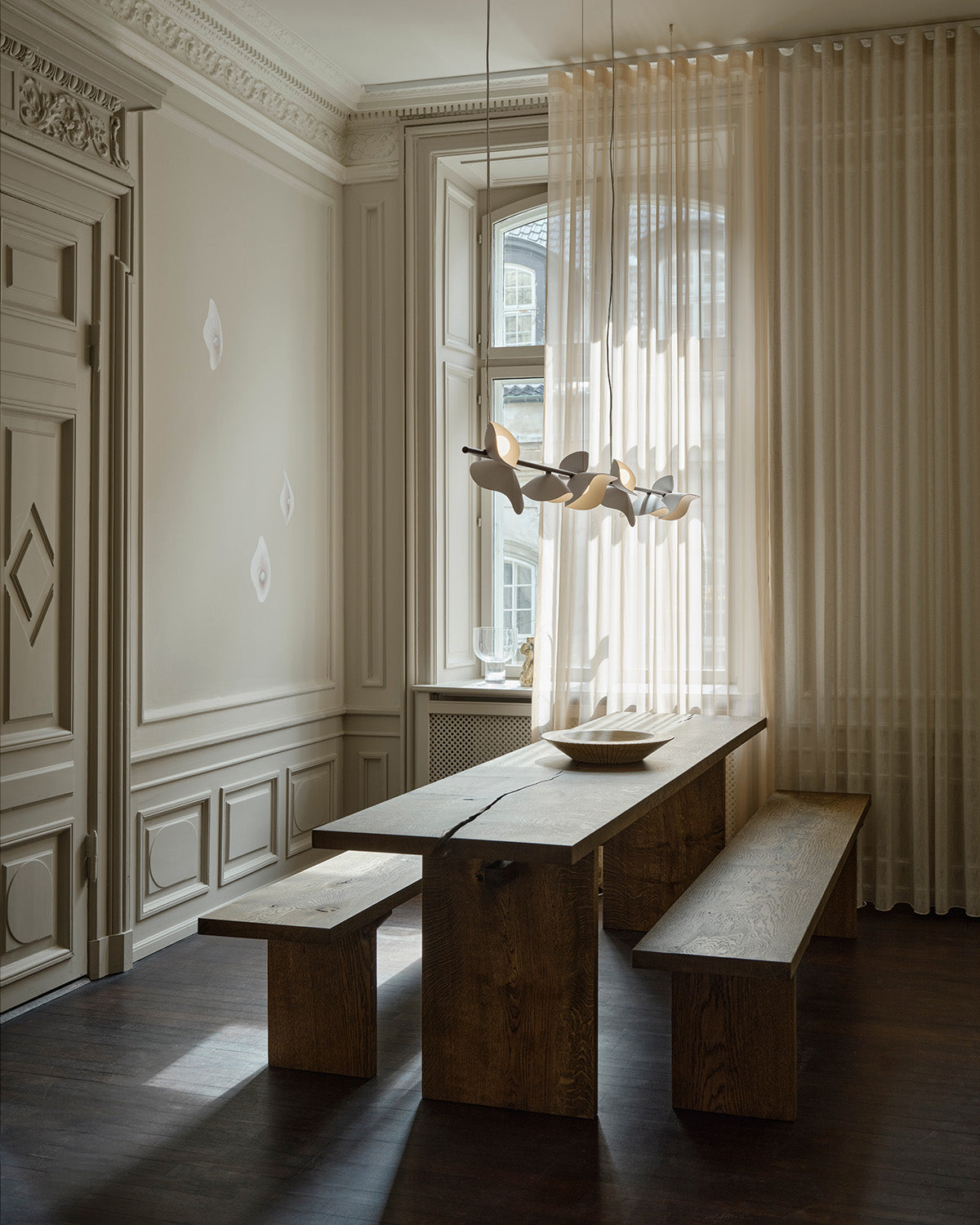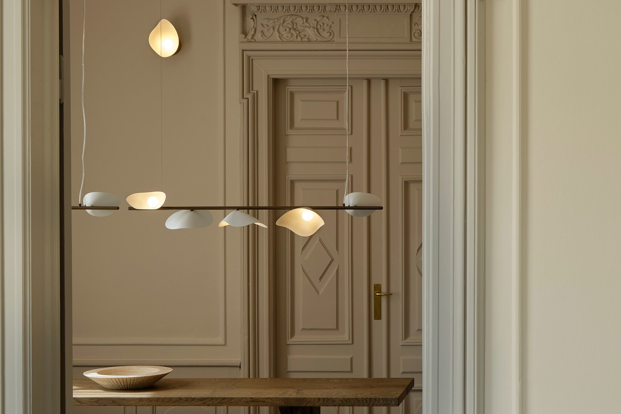 Florii 5 Linear is an elegant centerpiece that redefines the modern chandelier. Integrated LED technology ensures efficient and long-lasting illumination, which can be easily replaced without the need for tools. The linear metal bar adds contrast and depth to the translucent white shades in polycarbonate, creating a captivating expression that draws the eyes towards their soft organic shapes.
