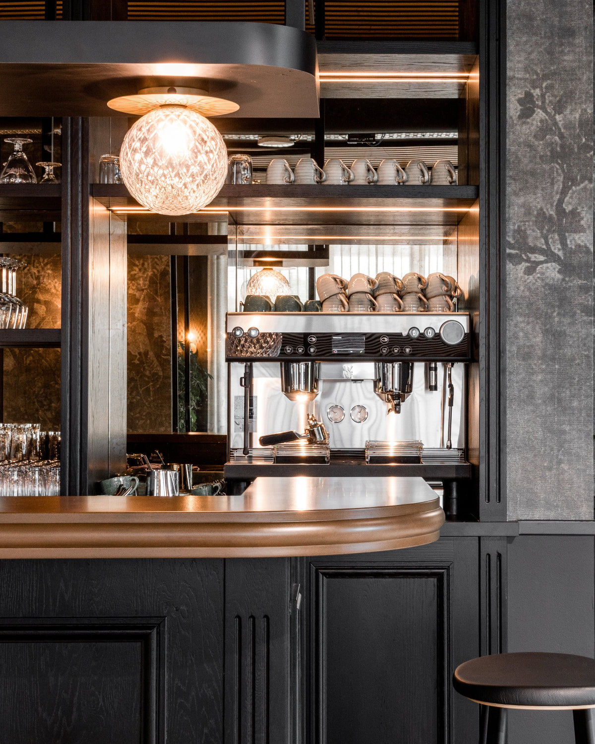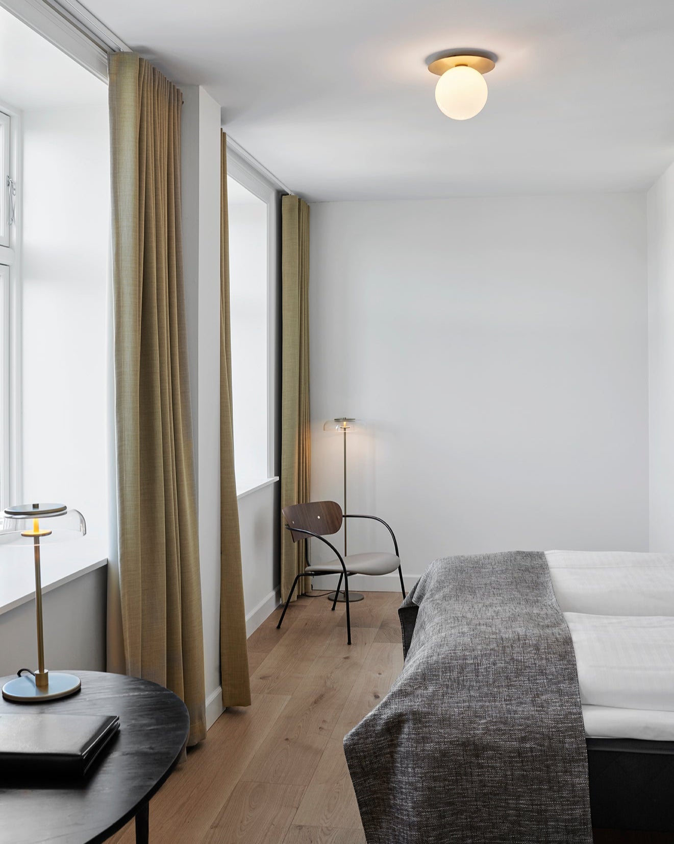 Liila 1 Large is a single lamp designed for wall or ceiling mounting. With a simple and elegant form, it features a thin, round metal plate in golden metal and a hand-blown opal white glass sphere. Additionally, the lamp has an IP44 rating.