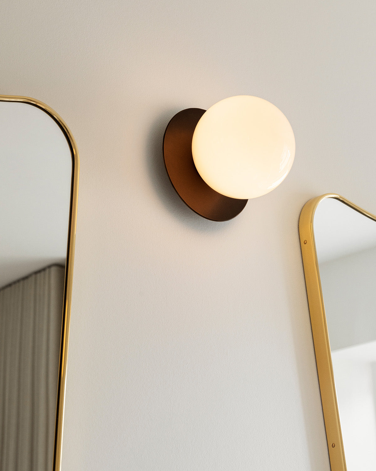 Liila 1 Medium is a single lamp functioning as either a wall or flushmount light. The lamp is simple in its form, consisting of a thin, round sheet of metal in a dark bronze finish. A mouth-blown opal white glass sphere is placed upon the metal backplate, which casts a soft, ambient light and gives the lamp a floating appearance.