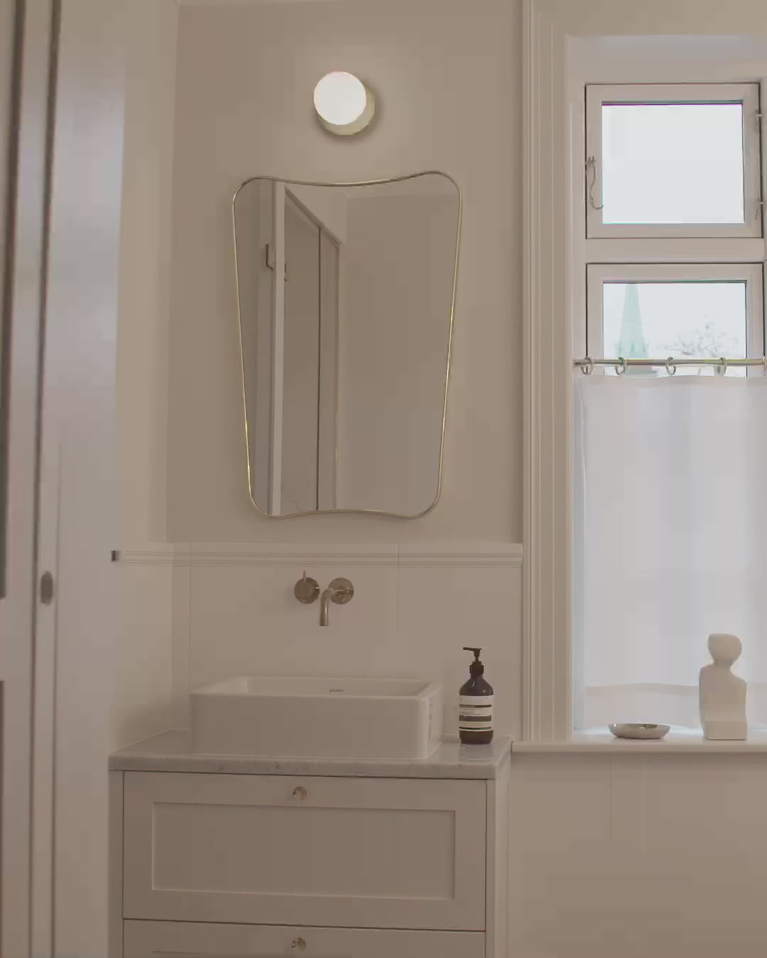 Liila 1 Small is a simple and minimalistic wall and ceiling lamp with relevance in both small and large homes. The lamp consists of a round backplate in golden metal, supporting an opal white glass globe from which light is softly diffused. Liila 1 Small can be used as a ceiling light in the corners of a dining room and thus support the main lighting, which is usually focused above the dining table. All Liila 1 wall and ceiling lamps are IP44 rated and approved for use in the bathroom.
