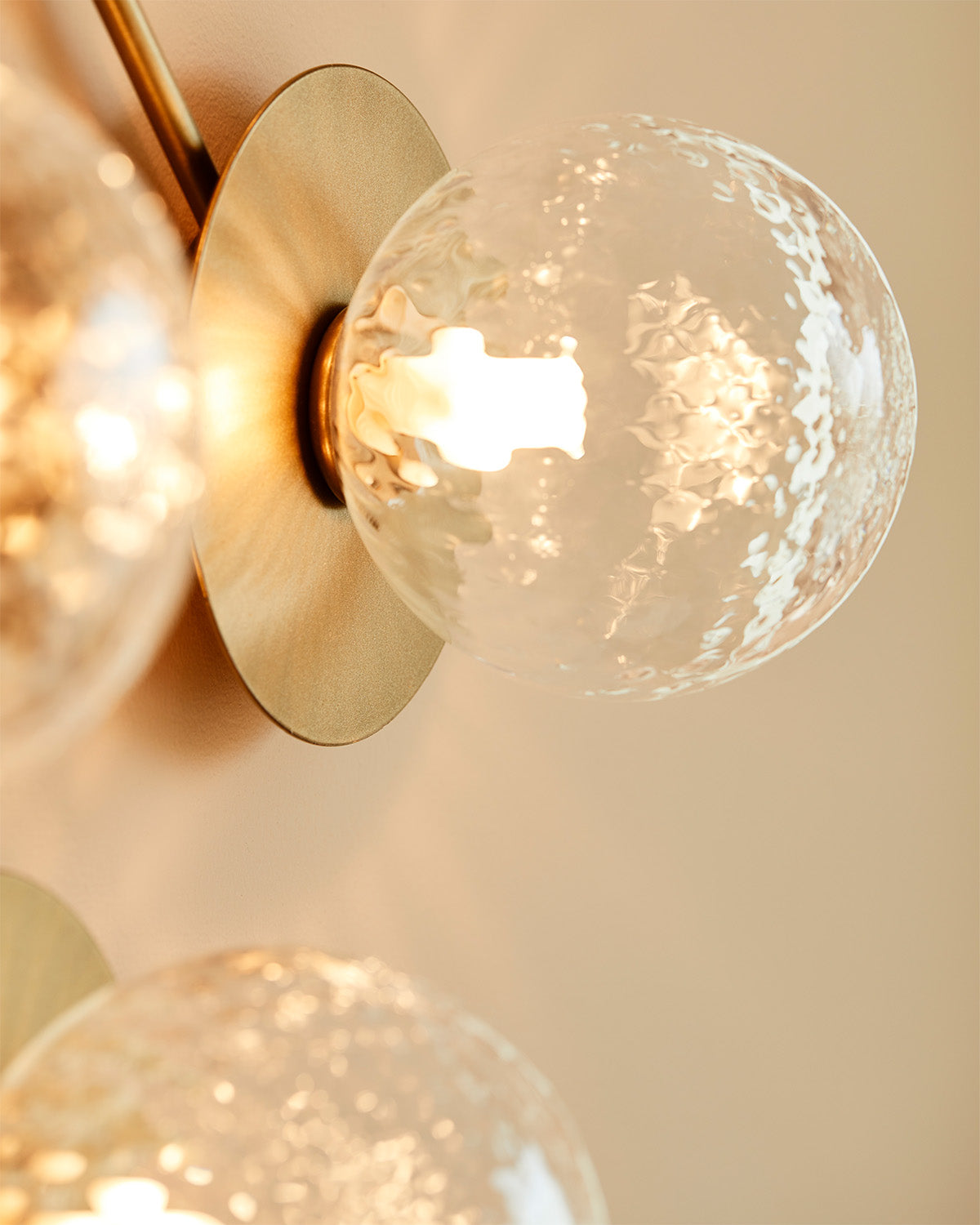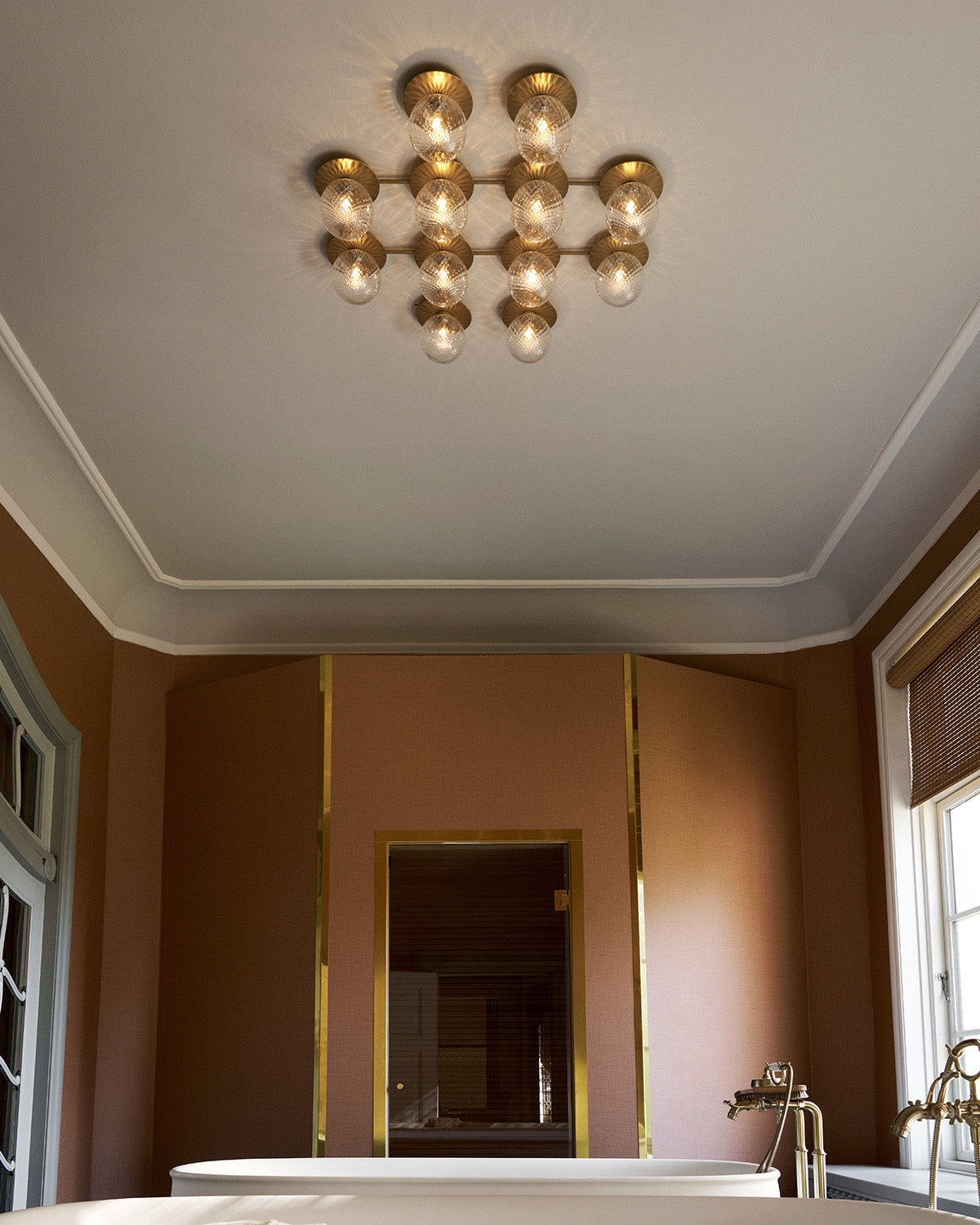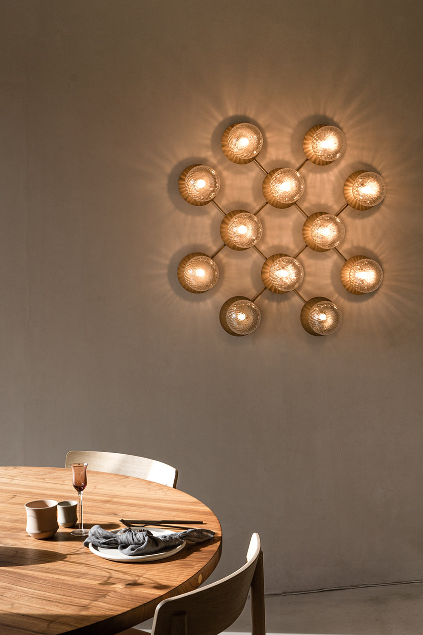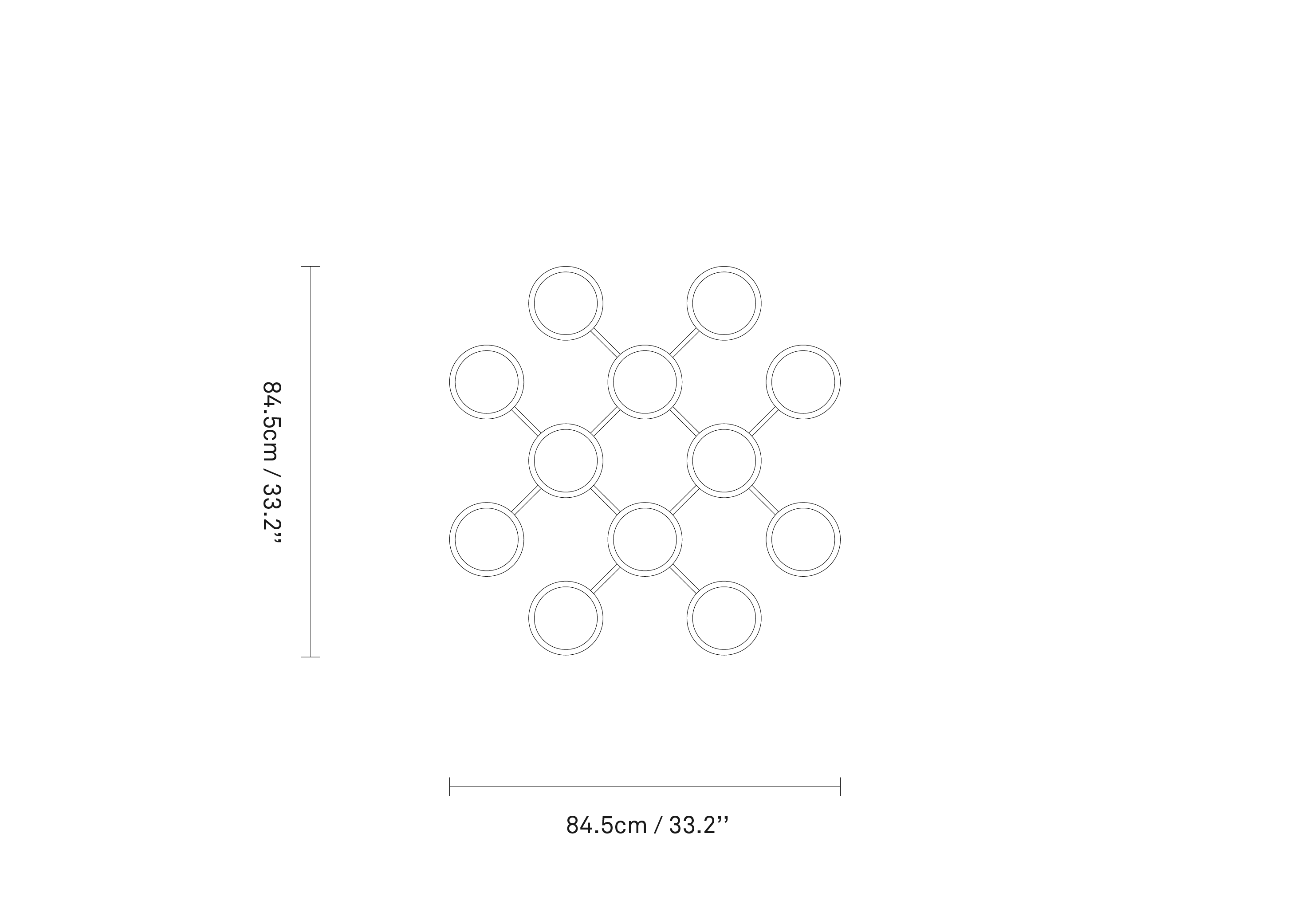 Liila 12 is a sophisticated lamp that seamlessly merges function and aesthetics into a decorative work of art for walls or ceilings. The design features 12 elegant, circular metal plates that create a light and floating effect around the clear glass domes. Its minimalist and modular construction is distinguished by details that reflect the Nordic design tradition, while the transparent glass elements infuse the space with a playful and dynamic glow.
