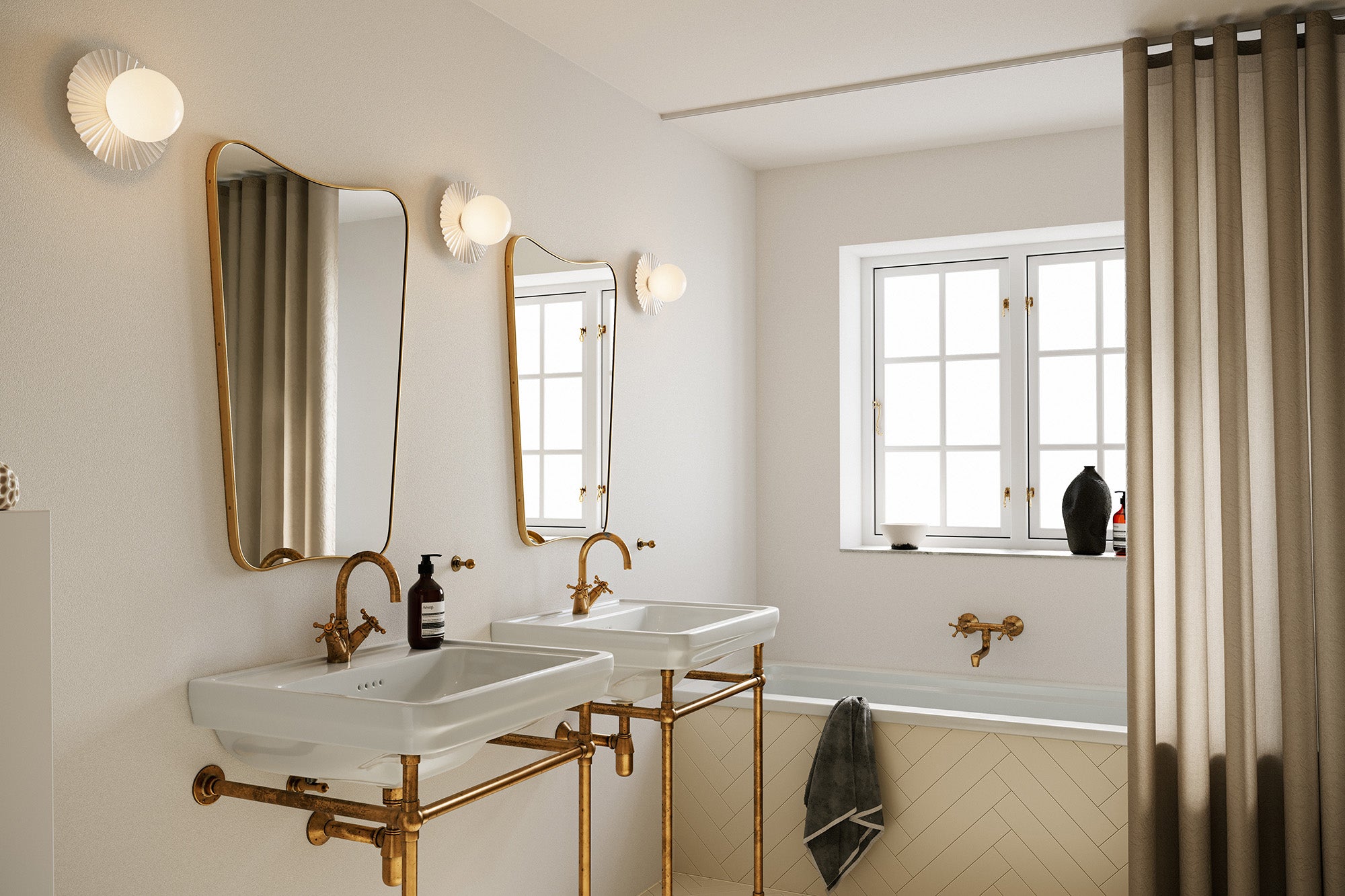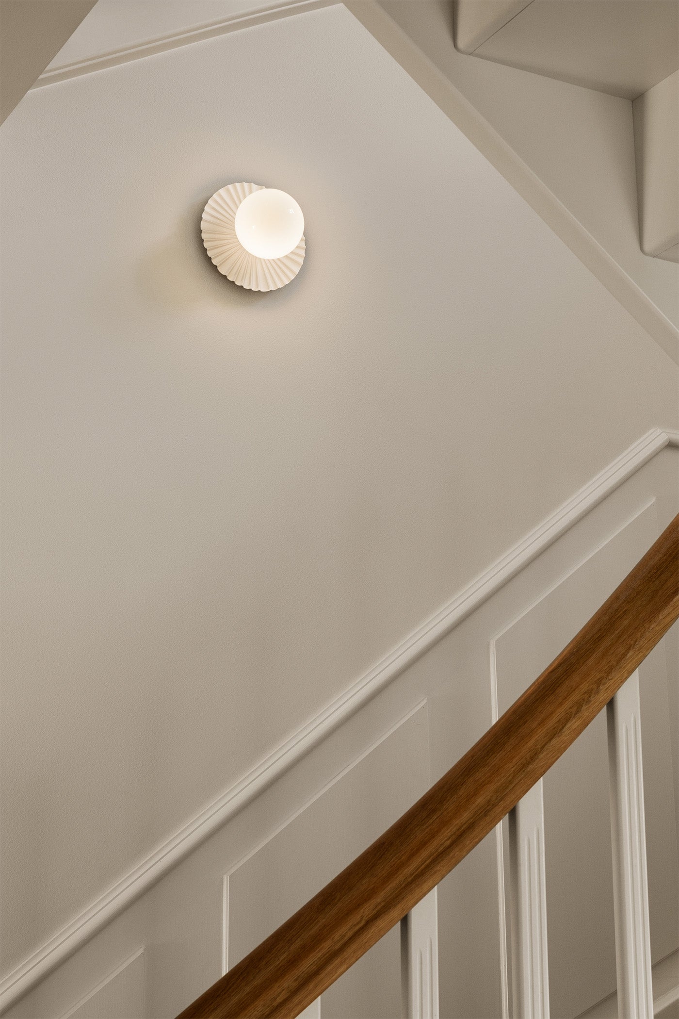 Liila Muuse Small is a wall and ceiling light with an artistic expression. The round metal back plate is styled with asymmetric waves, reflecting the light from the small opal white glass globe placed in the middle of the lamp. The soft curves and white powder coating create associations to the classic white ceiling medallions in older buildings.