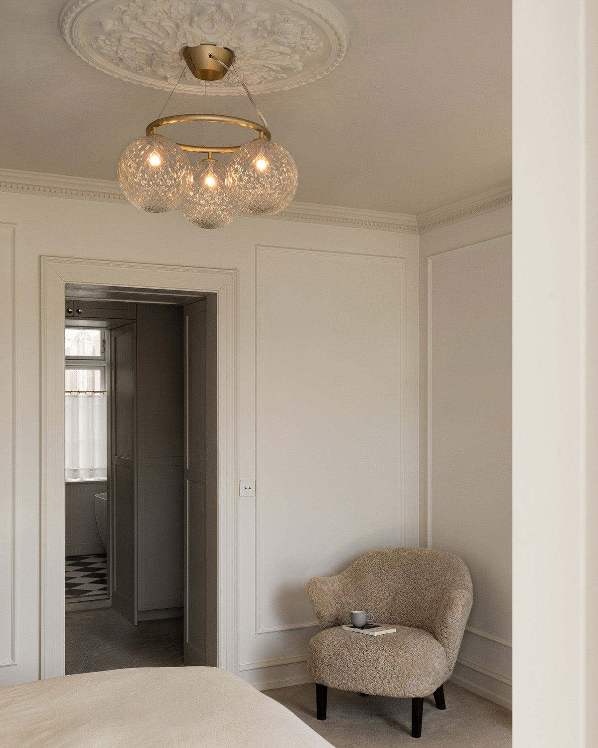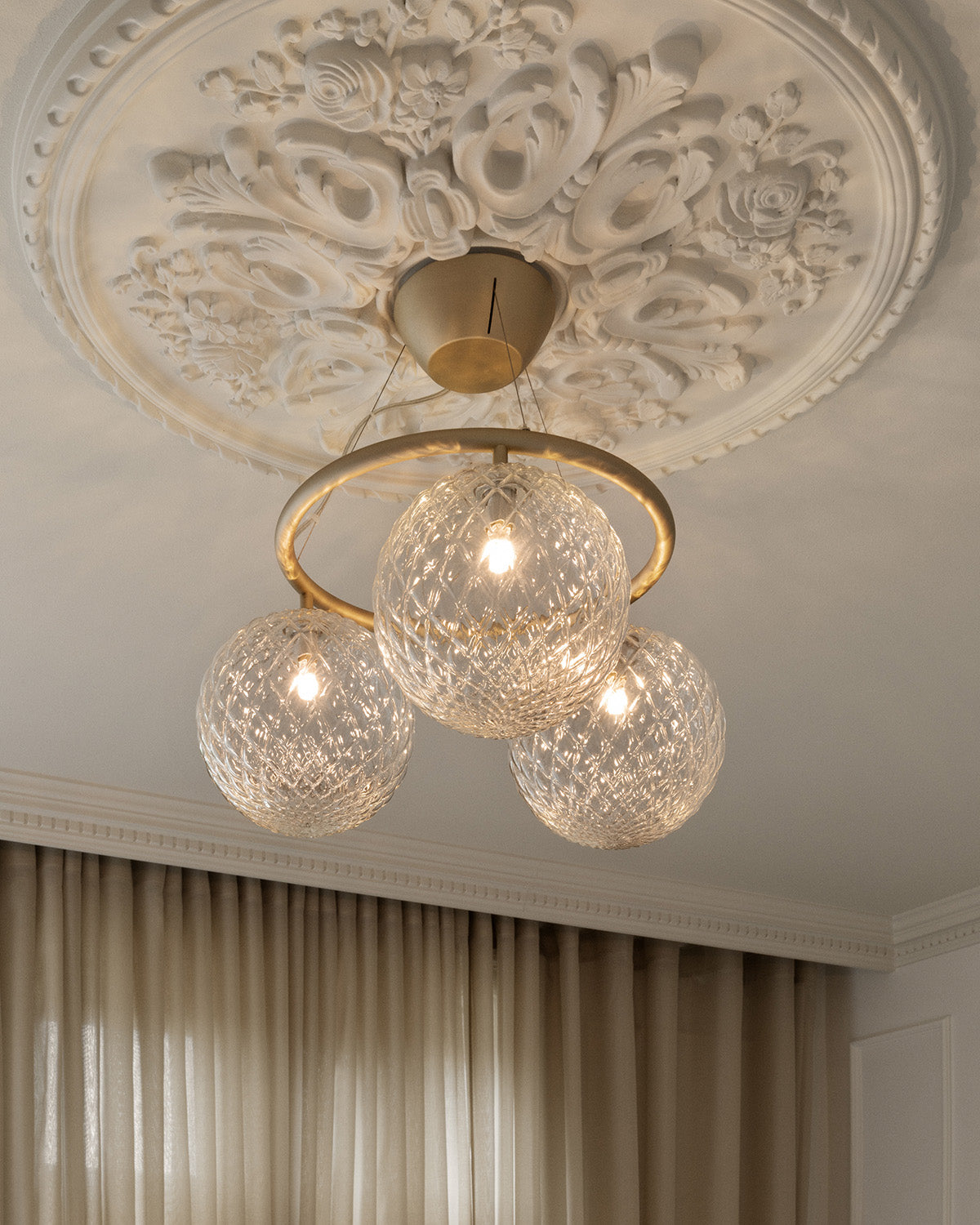The round Miira Circular chandeliers are a modern take on the classic centerpieces. Miira 3 Circular is the smallest of the three round Miira chandeliers, and has a diameter of just Ø54 cm. A round metal ring in a light brass powder coating supports 3 mouth-blown glass domes in optic clear glass, and a sensuous light is spread to the room. The simple design and modest size make Miira 3 Circular relevant in many interior contexts such as the bedroom. The chandelier can utilise the open position in the middle of the ceiling above the bed and spread an atmospheric light to the entire room.
