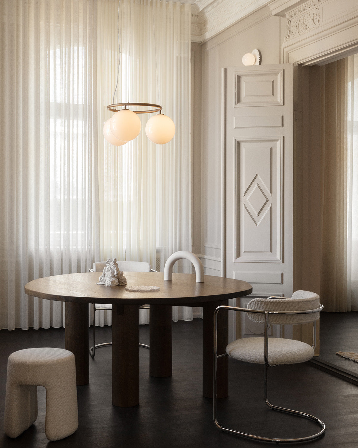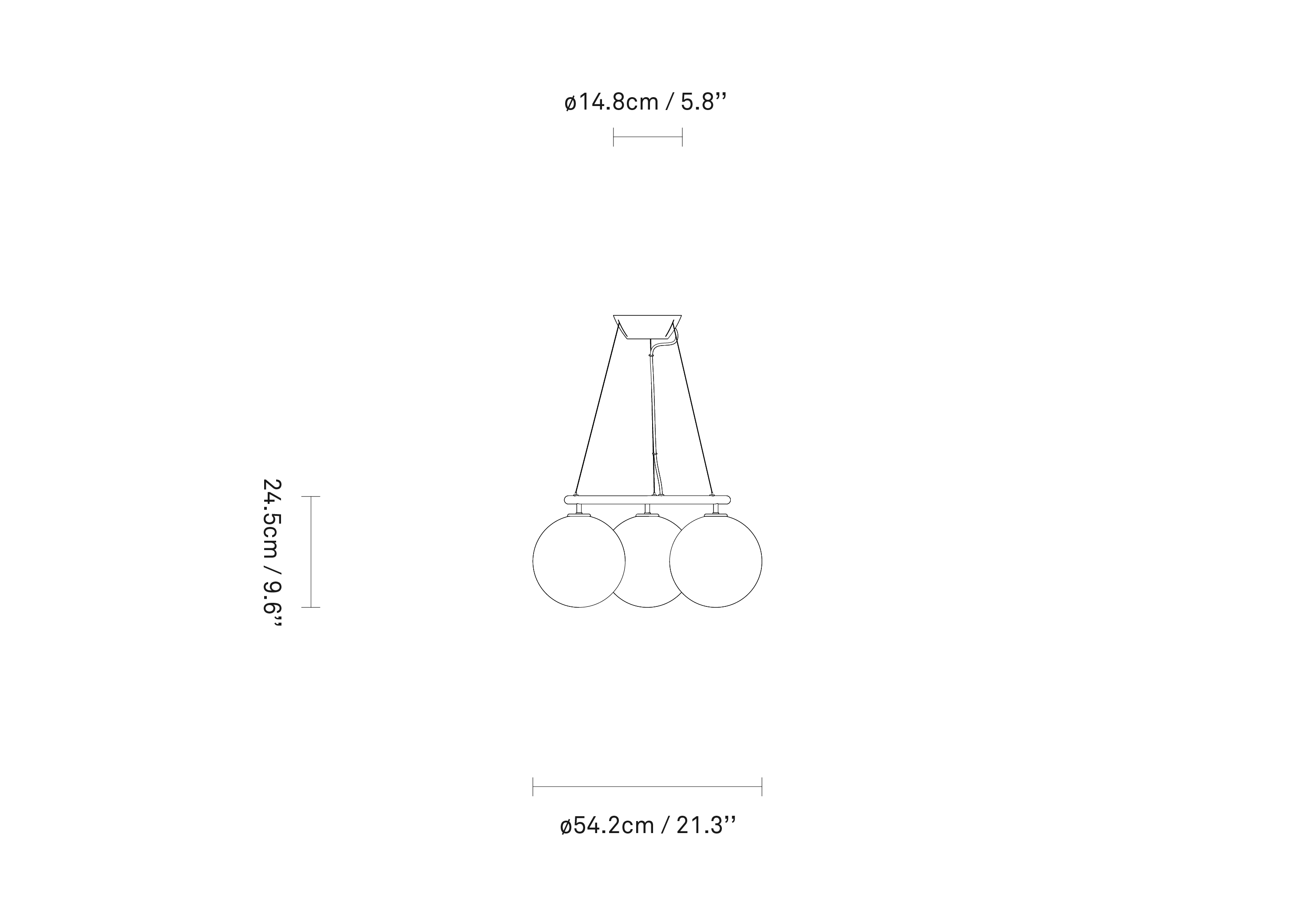 Miira 3 Circular is the latest addition to the Circular-series and highly relevant in smaller rooms where the space is limited but a chandelier expression is desired. The distance to the ceiling is easily adjusted with a wire lock system, and the simple metal ring in dark bronze finish carries the three large mouth-blown shades in opal white glass, exemplifying modern design through its graphic silhouette. Let Miira 3 Circular chandelier illuminate the hall, living room or office.