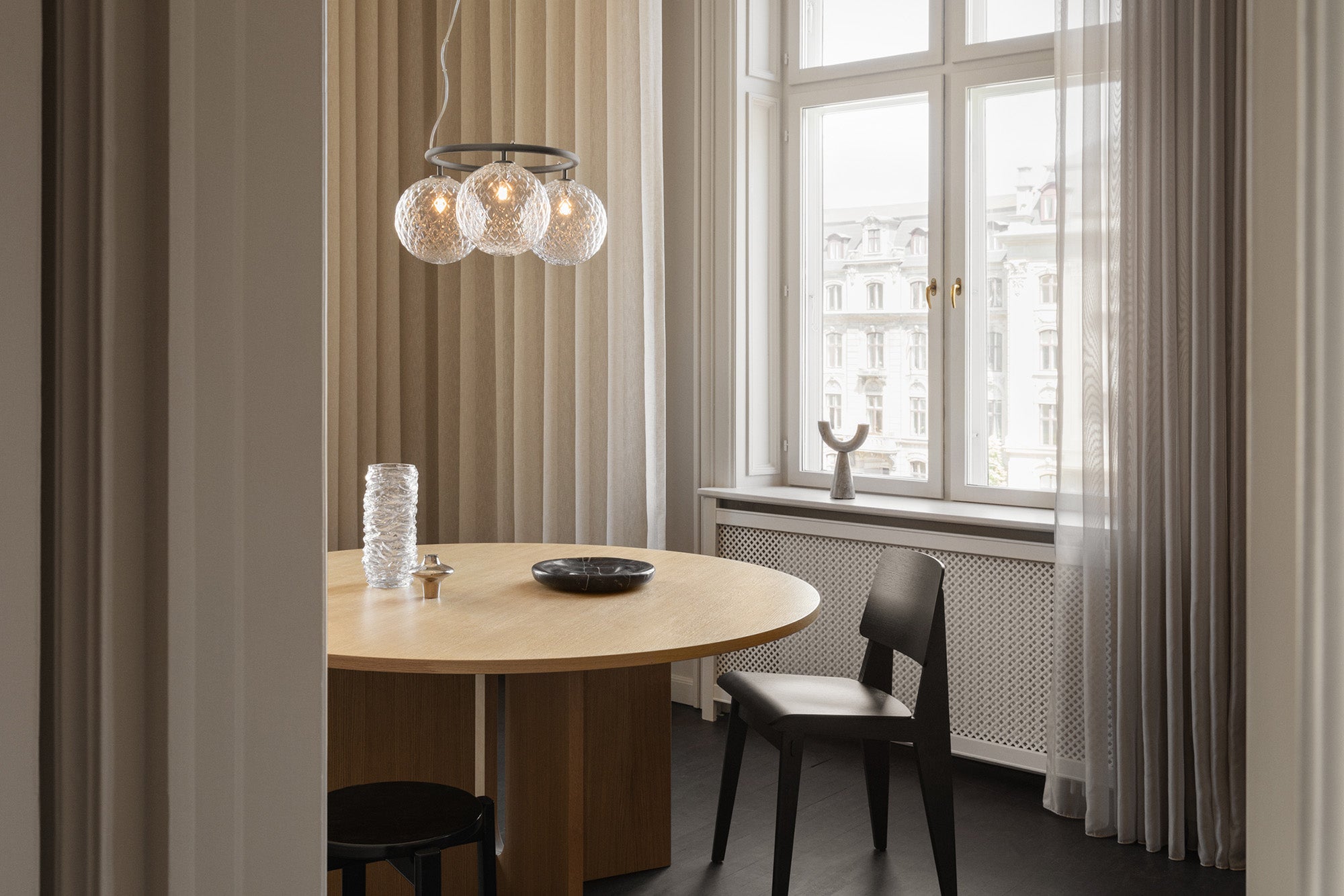 The Miira 3 Circular chandelier has a plump and balanced expression, and the clean design is complemented by an industrial look from the dark bronze metal. With a special wire system between the ceiling plate and the metal ring, it is possible to set the Miira 3 Circular to the ideal height in any room. The large mouth-blown glass shades in optic clear glass spread a brilliant, sensuous light to the surroundings and the organic design of the chandelier fits well above a round table.