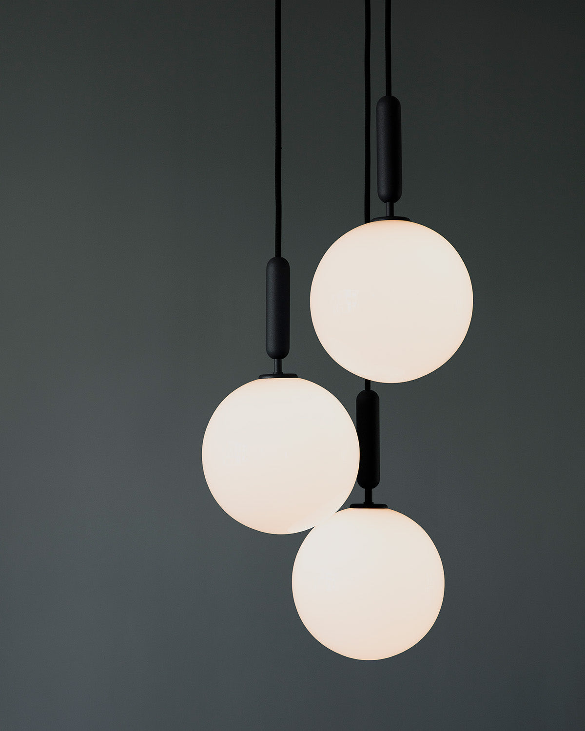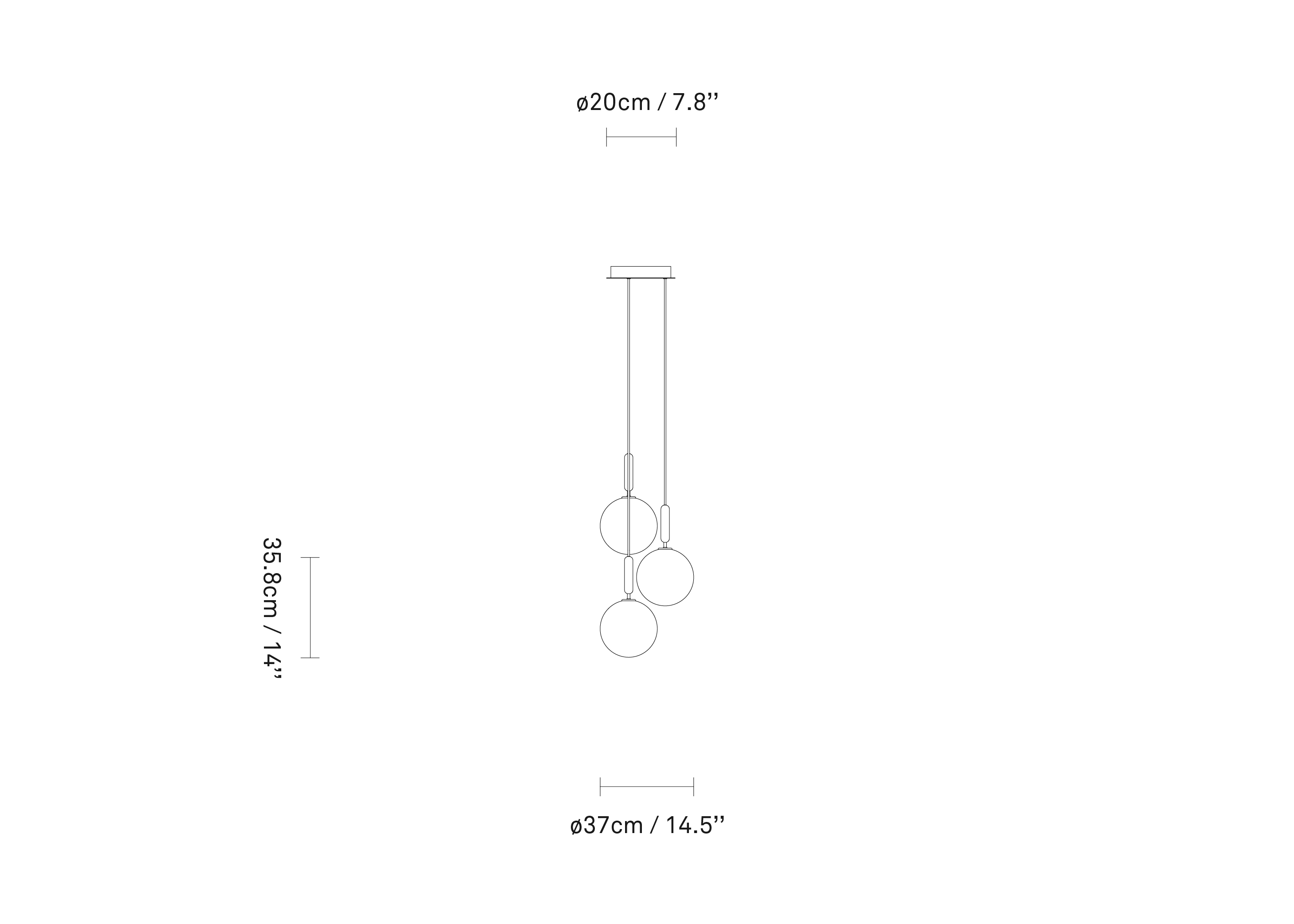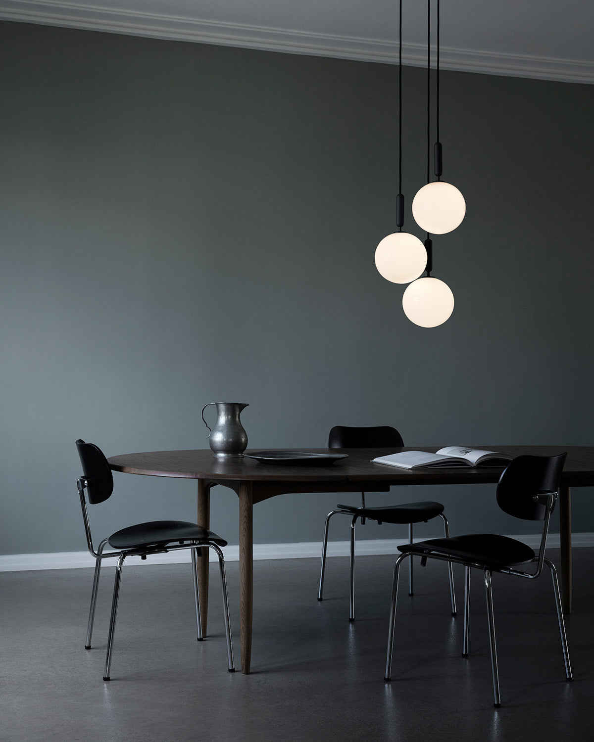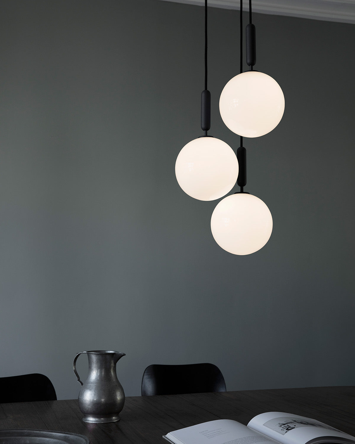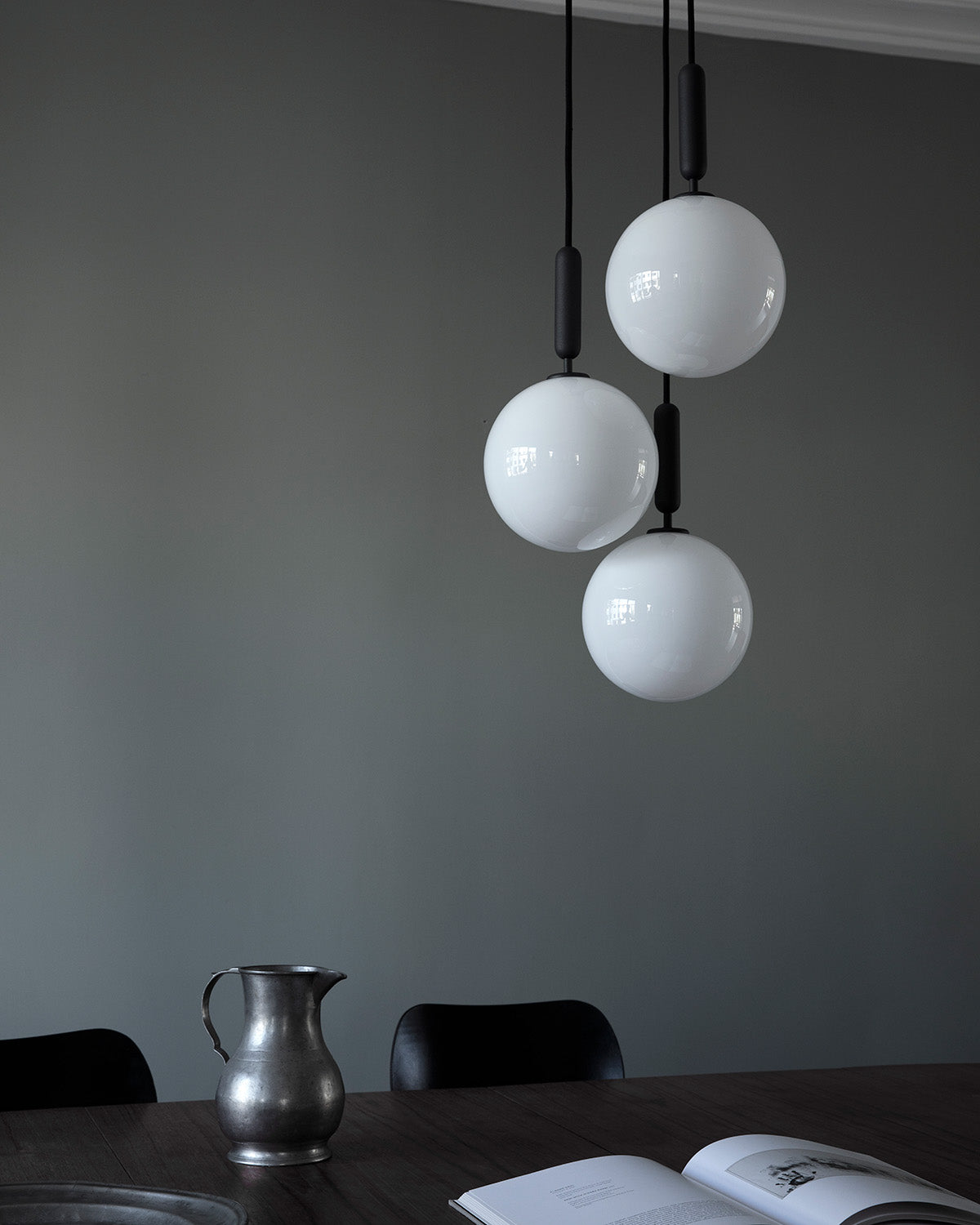 Miira 3 Large is a modern chandelier consisting of 3 pendants in a multi-light formation. The single pendants are suspended from the ceiling plate, and the sleek metal rods and bold glass globes make the pendants pop in the air. Miira 3 Large chandelier creates a cosy ambience over the dining table.