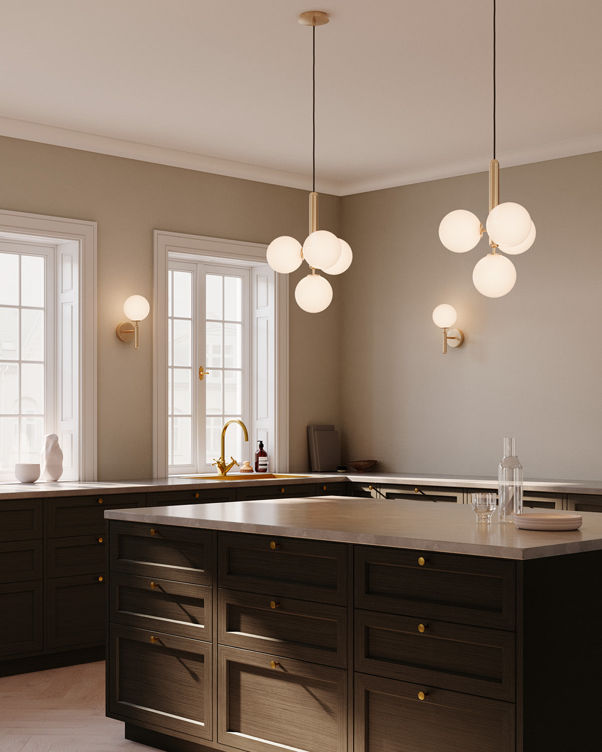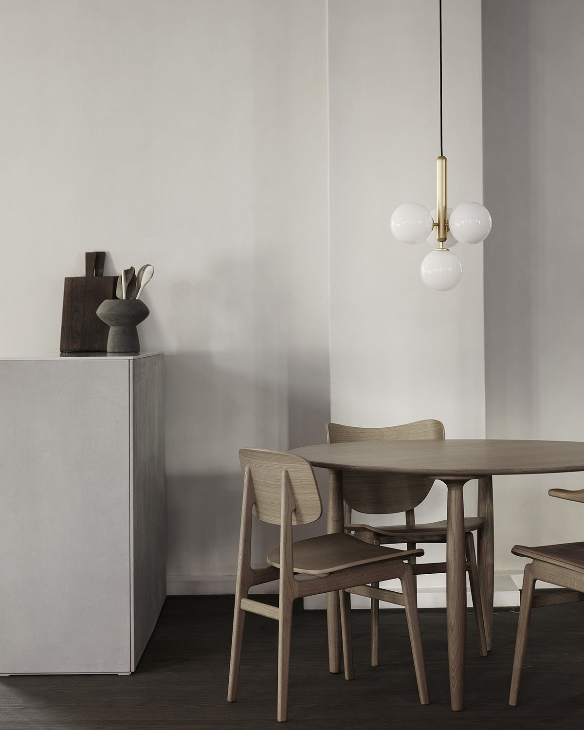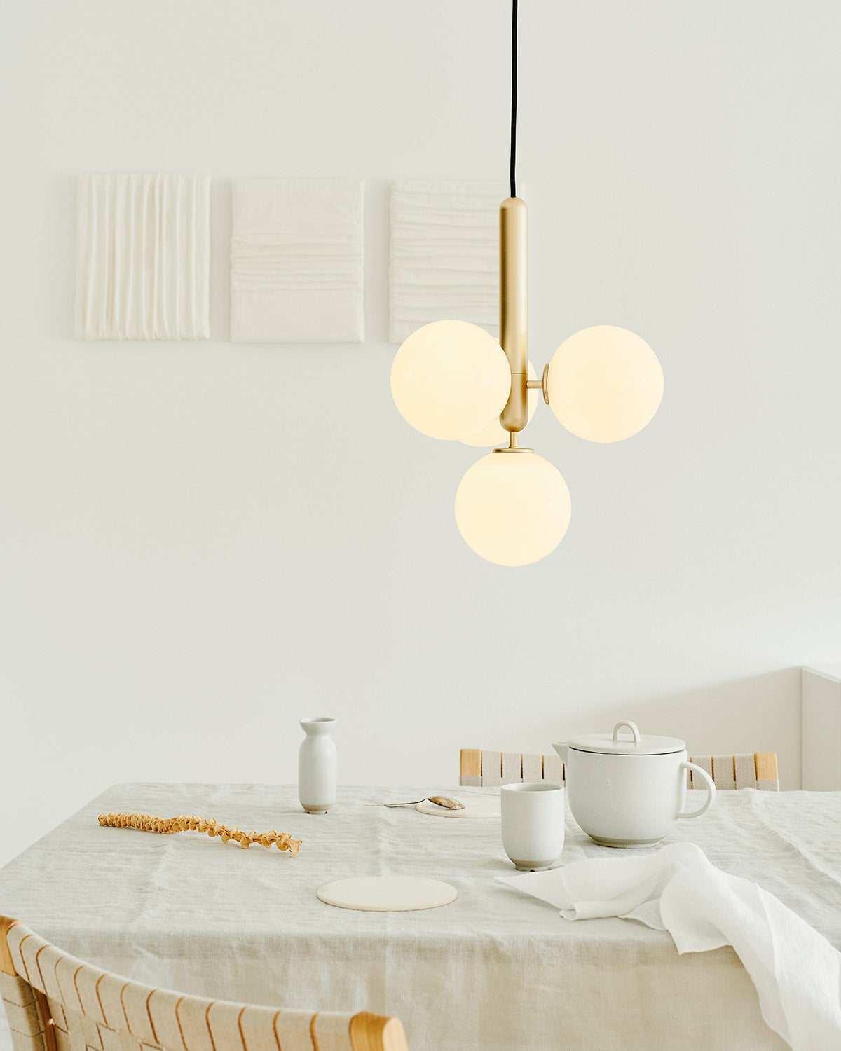 Miira 4 is a multi-light pendant with 4 mouth-blown glass globes. Brass coloured metal is complemented with opal white glass spheres, adding a calm and subtle expression to the room. With its sleek design and warm lighting, Miira 4 creates a cozy and inviting atmosphere. The pendant is highly applicable in both modern and traditional interiors.