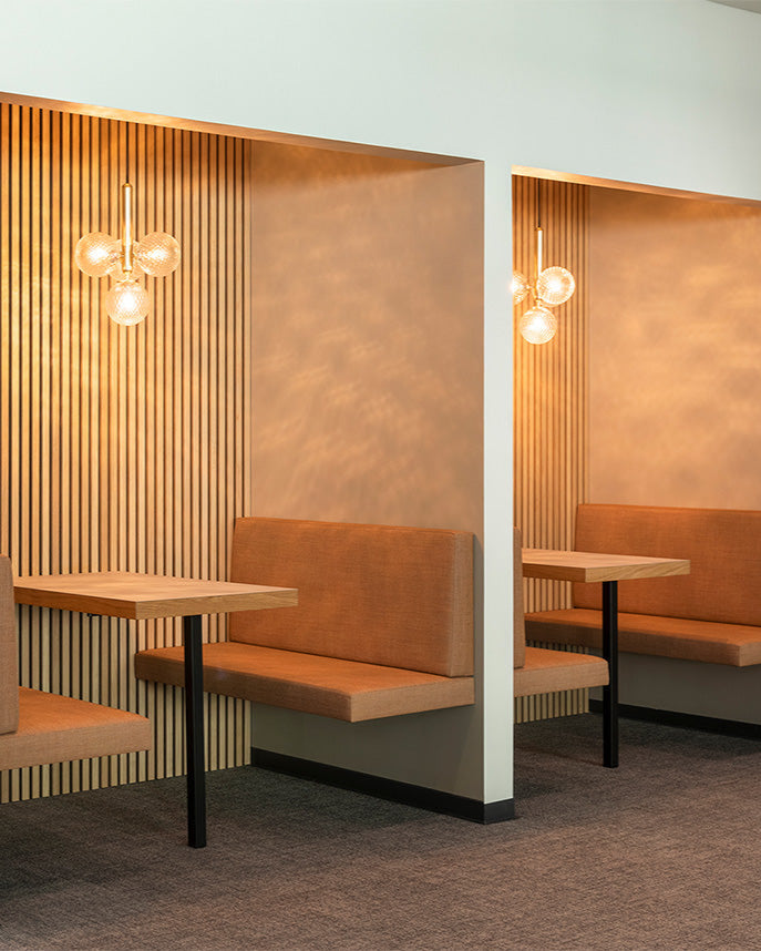 Miira 4 is a multi-light pendant with 4 mouth-blown glass globes. The combination of brass coloured metal and optic clear glass creates a modern choice of lighting.