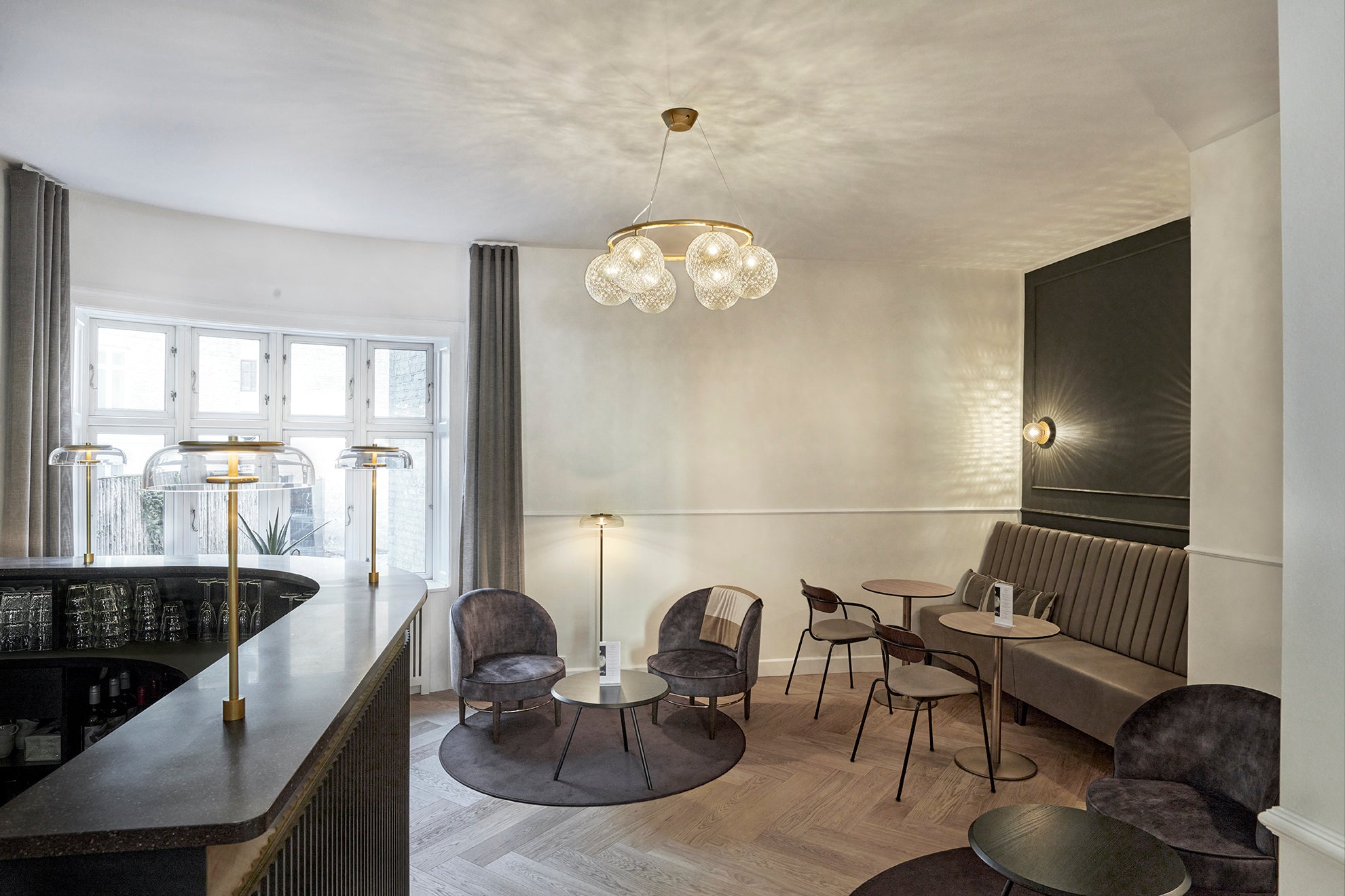 Miira 6 Circular has a classic appearance and is designed to hang high or low from the ceiling. The chandelier comprises a powder-coated metal ring in brass finish, and mouth-blown glass domes in optic clear glass spread a sensuous light.