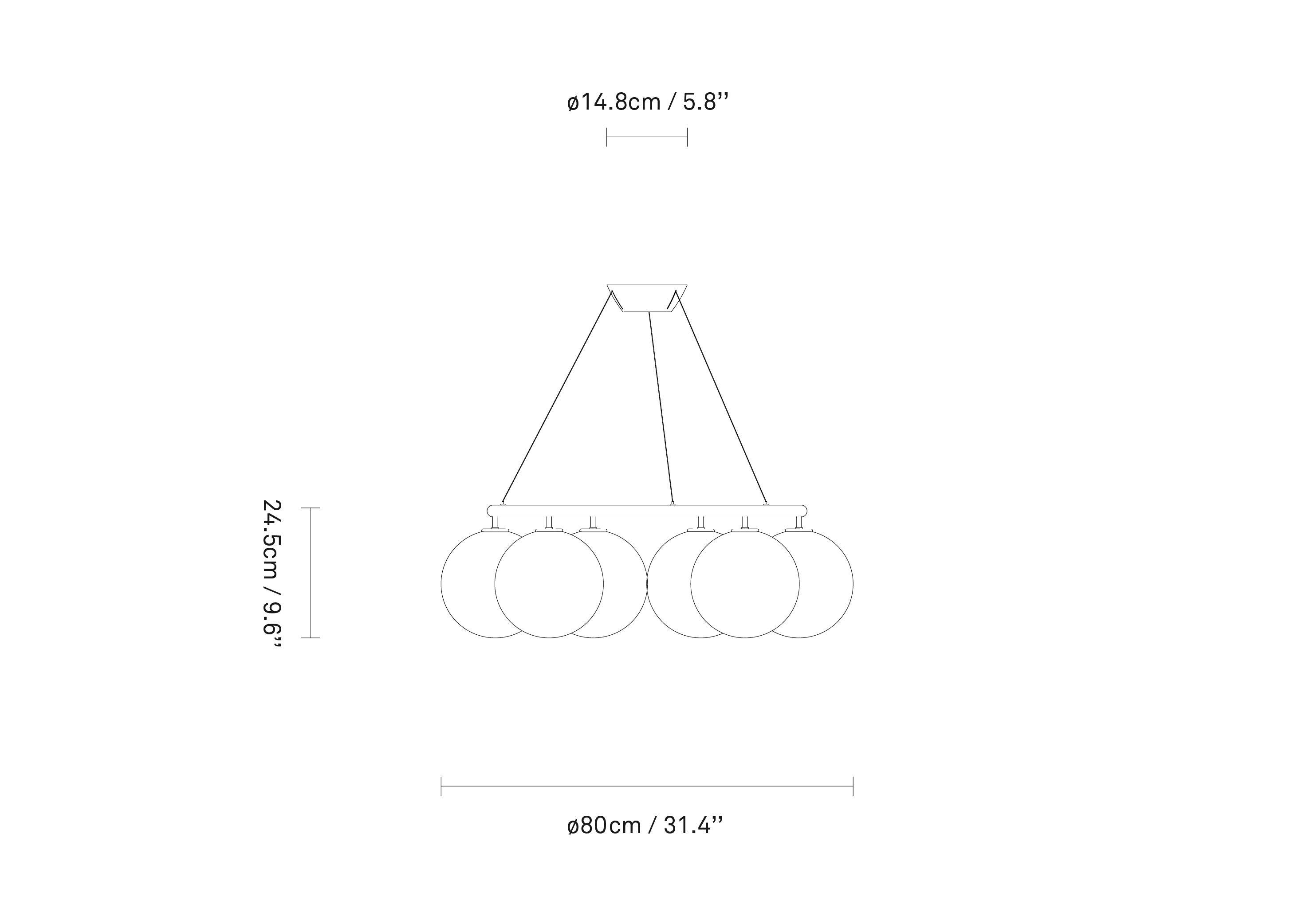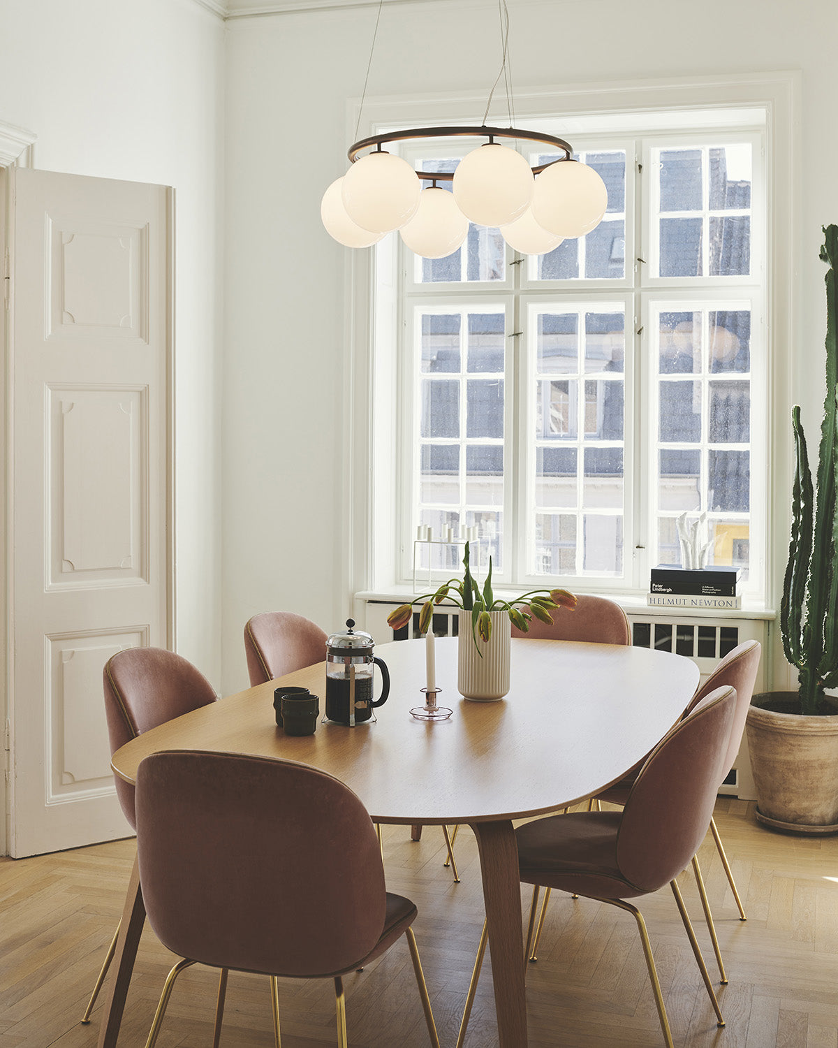 Miira 6 Circular is a modern chandelier designed with a round metal ring in brass-coloured anodized aluminium. From the metal construction, six mouth-blown opal white glass globes are attached. Miira 6 Circular is suitable in the dining room above a round or rectangular table where the opal glass globes provide a bright and even layer of light to the immediate space below.