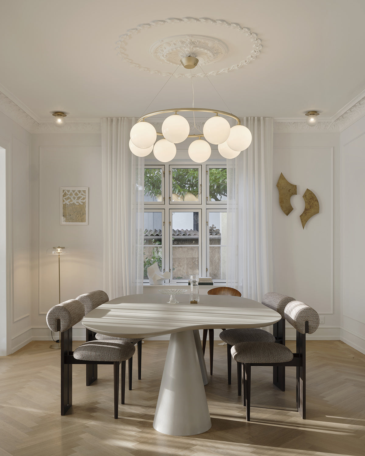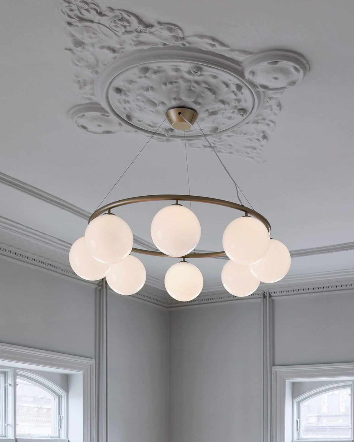 Miira 8 Circular offers a timeless and versatile design that can be hung at various heights to fit any space. The brass-colored powder-coated metal ring and opal white glass domes emit a warm and inviting light, adding a touch of luxury to any room. The soft shapes and soft colours effortlessly complements any interior design, making Miira 8 Circular a valuable and stylish investment. Use the chandelier above a large dining table or as a focal point in a spacious hallway.