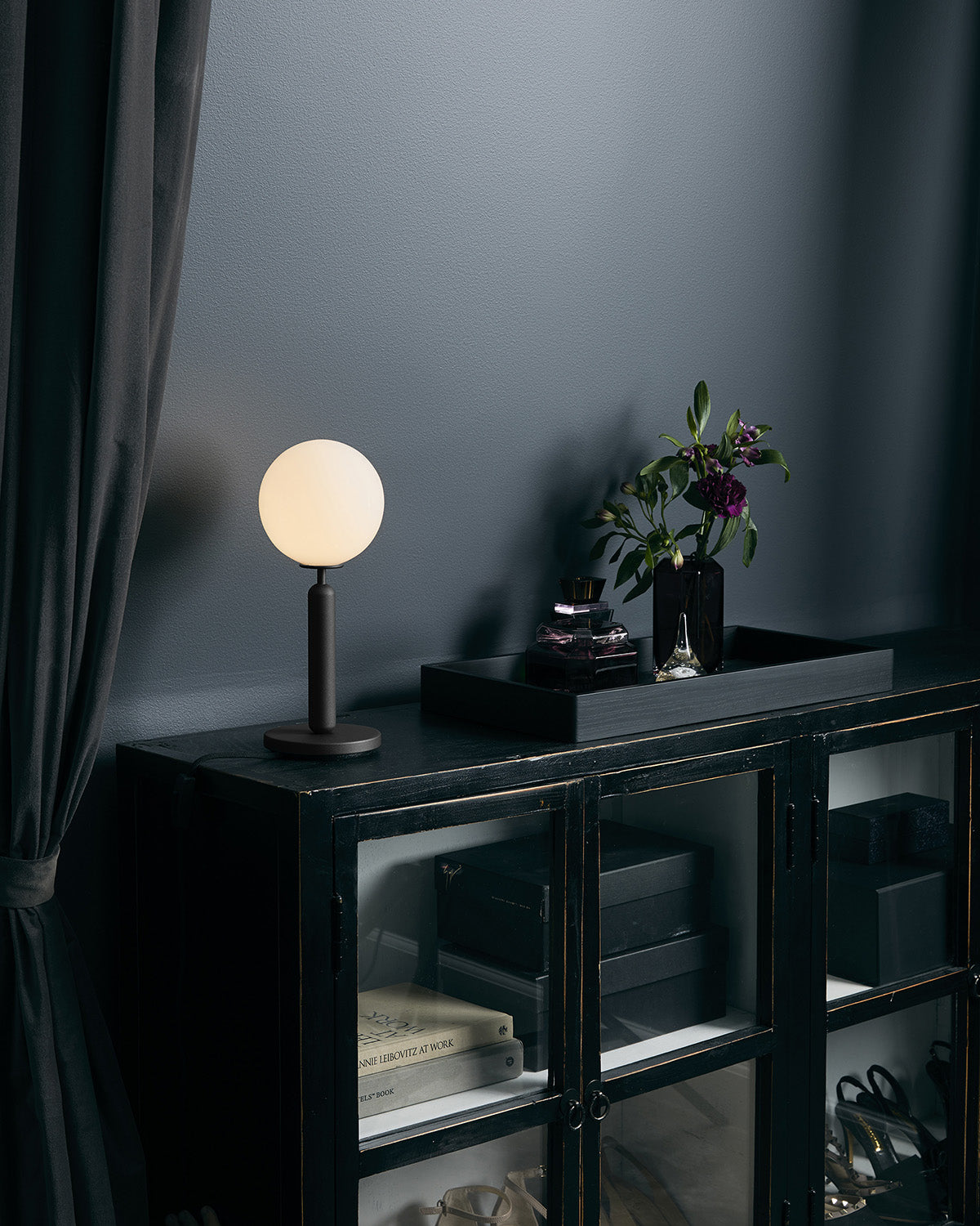 Table lamp in contrasting rock grey metal finish and opal white glass. The Miira Table lamp makes a bold impression with a minimum of complexity and is set on a solid, round foot and topped with a neatly mouth-blown glass shade. Cable with on/off switch.