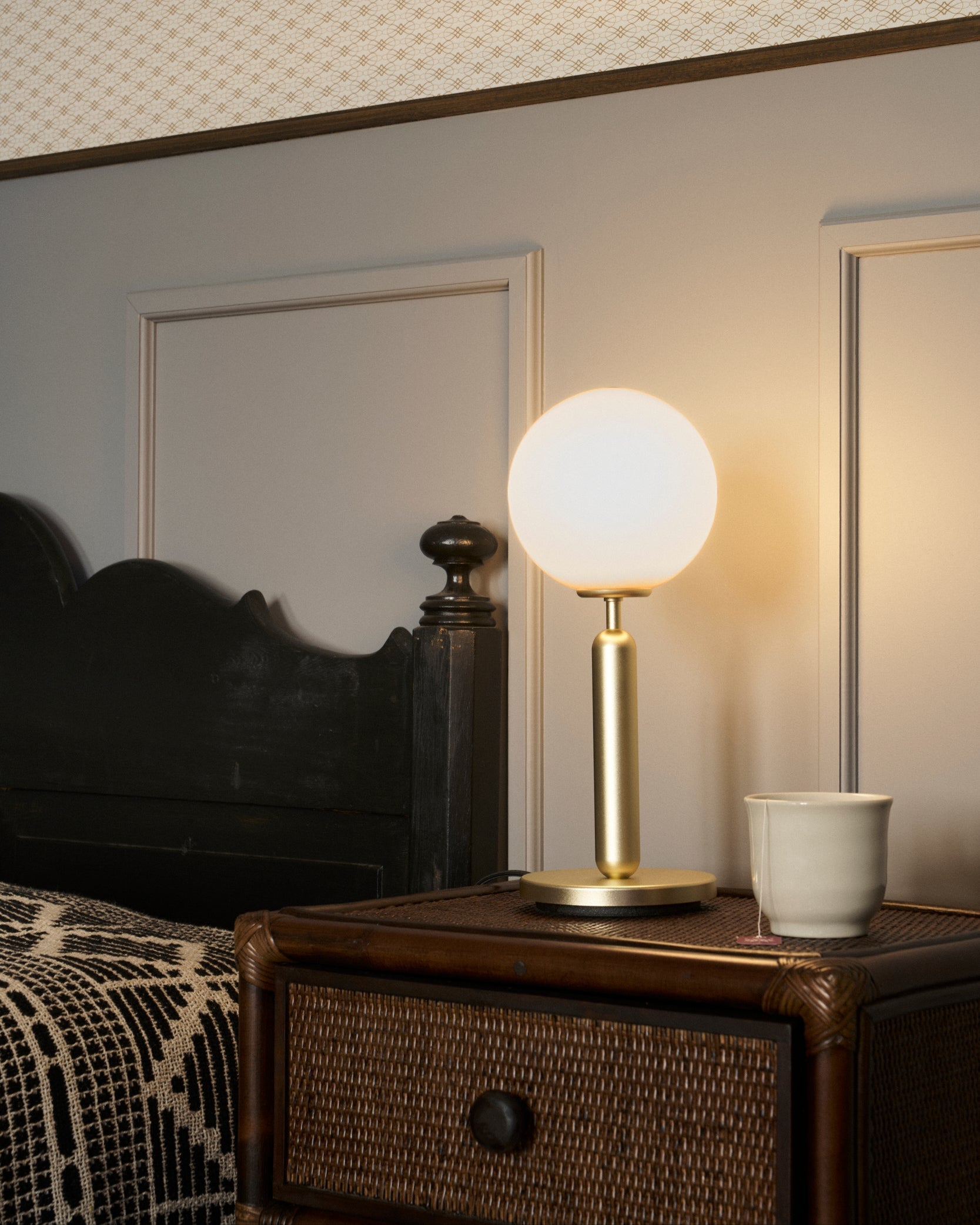Table lamp in contrasting rock grey metal finish and opal white glass. The Miira Table lamp makes a bold impression with a minimum of complexity and is set on a solid, round foot and topped with a neatly mouth-blown glass shade. Cable with on/off switch.