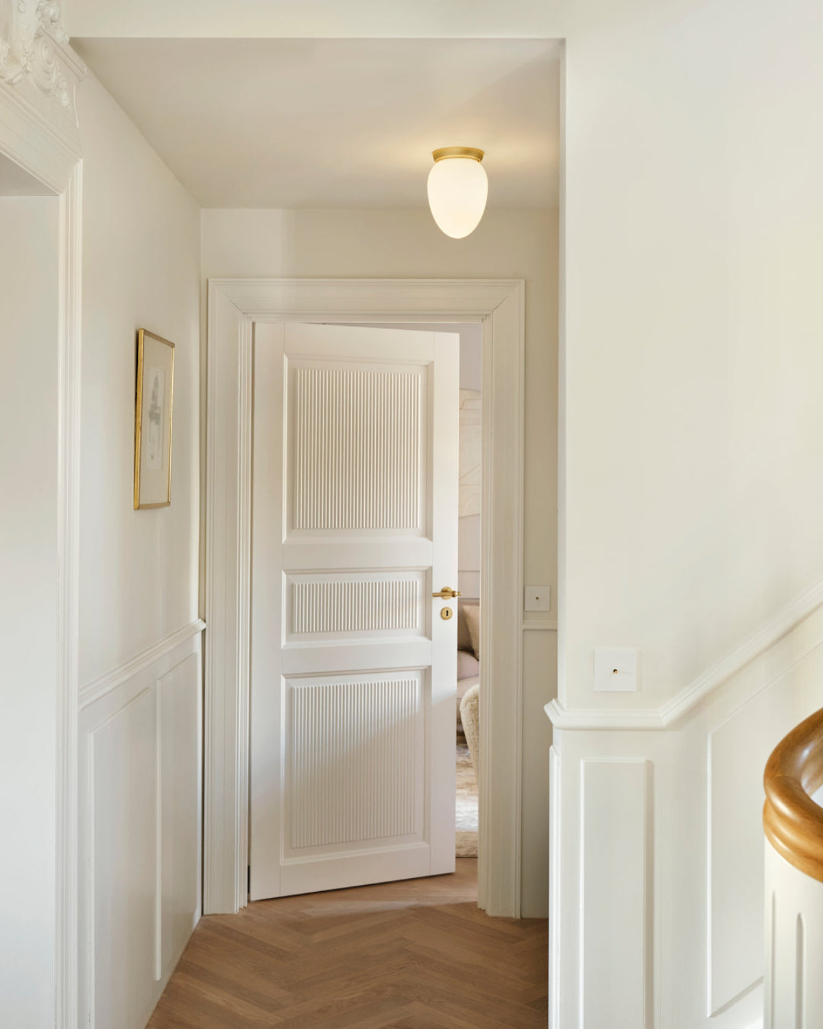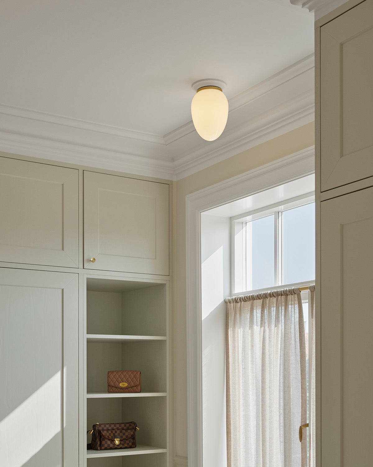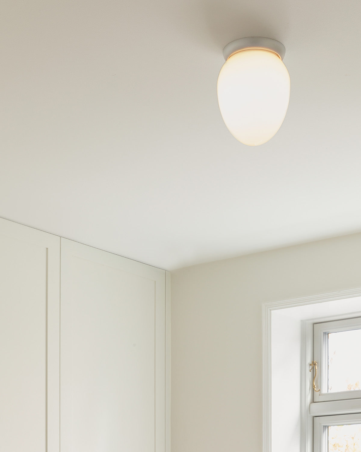 Rizzatto 171 is a simple drop-shaped spotlight inspired by the large pendant lamps from the Rizzatto collection. This ceiling light consists of a silver metal ring and an oval-shaped glass globe. The lamp shade is made of mouth-blown glass in opal white and offers a soft and glare-free light. The Rizzatto 171 ceiling lamp does not take up much space yet provides sufficient lighting to the immediate surroundings, making it a good choice of lighting in long, narrow spaces such as the hallway.