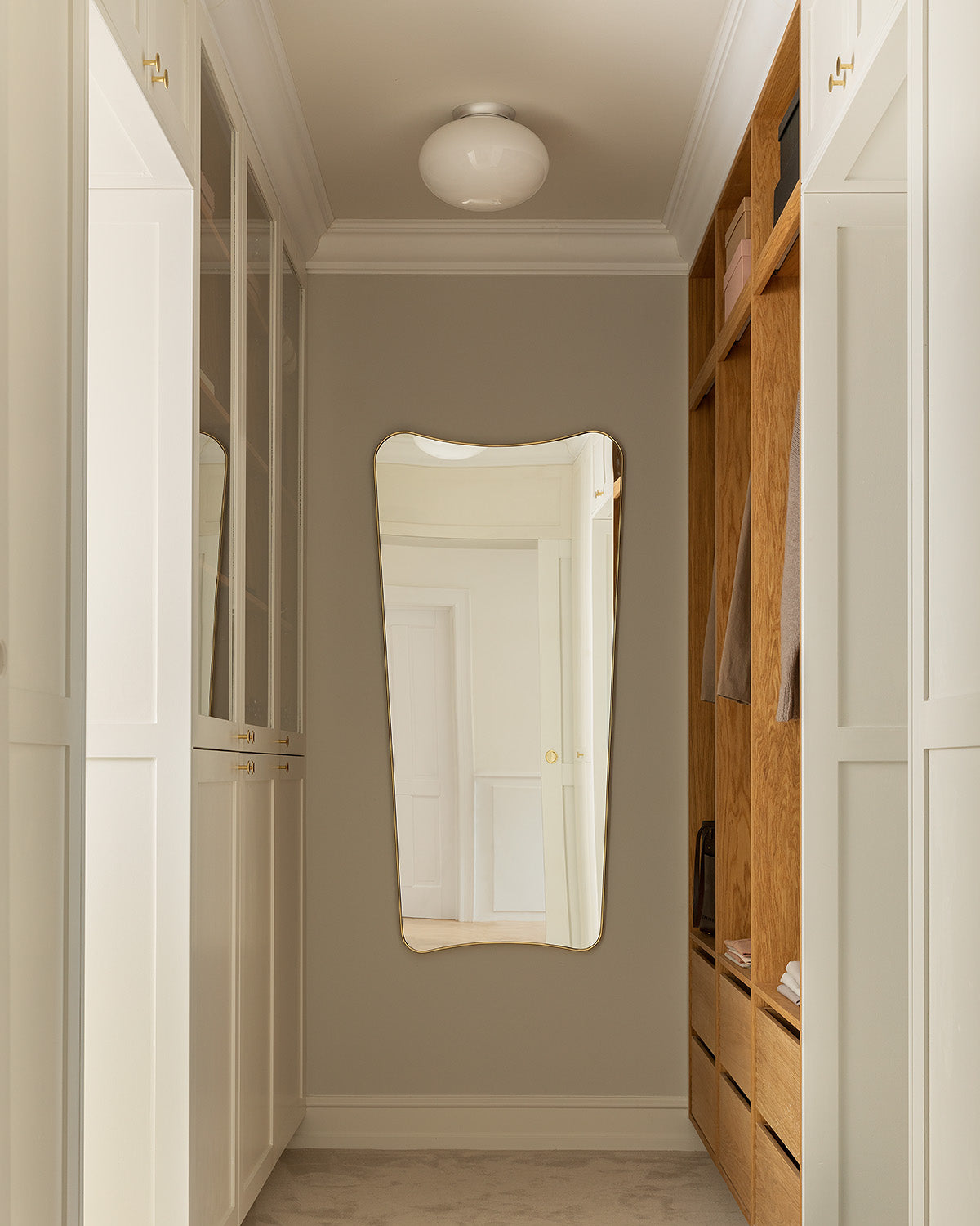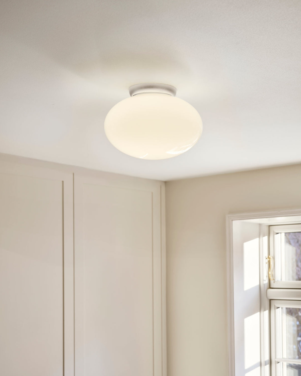Rizzatto 301 is a decorative ceiling light in an organic expression, and an extension of the other lights from the Rizzatto collection. The elliptical shade in opalized glass is attached to a metal base in a satin silver finish, and the pure, simple choice of materials adds a classic and decorative element to the room. Rizzatto 301 ensures a comfortable light that is not blinding and is highly relevant as lighting in a walk-in wardrobe or smaller rooms where this ceiling lamp will not take up much space.