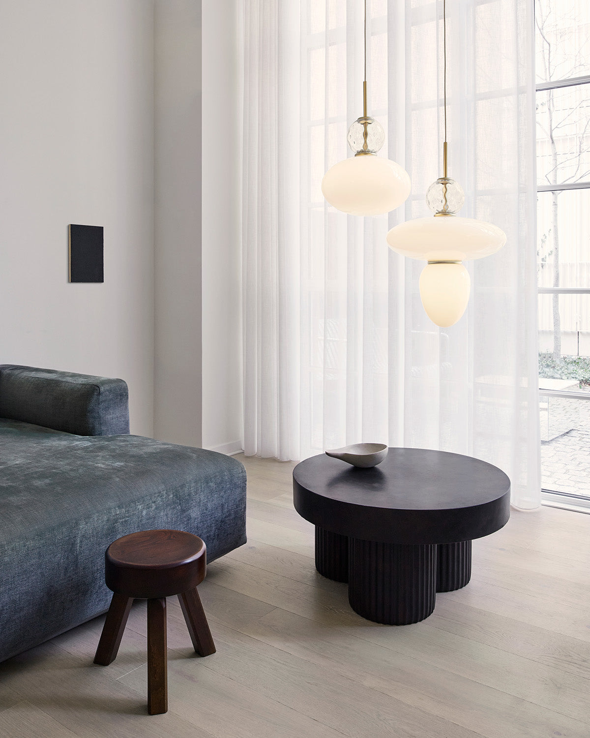 Rizzatto 43 pendant features a sculptural design with a distinctive silhouette. The pendant includes a mouth-blown glass shade with a satin brass suspension, creating a harmonious balance of softness and sophistication. The satin brass finish adds a touch of warmth and understated luxury. Whether placed above a dining table, in a living room, or as a statement piece in a hallway or bedroom, its versatile design adds sophistication to any setting.