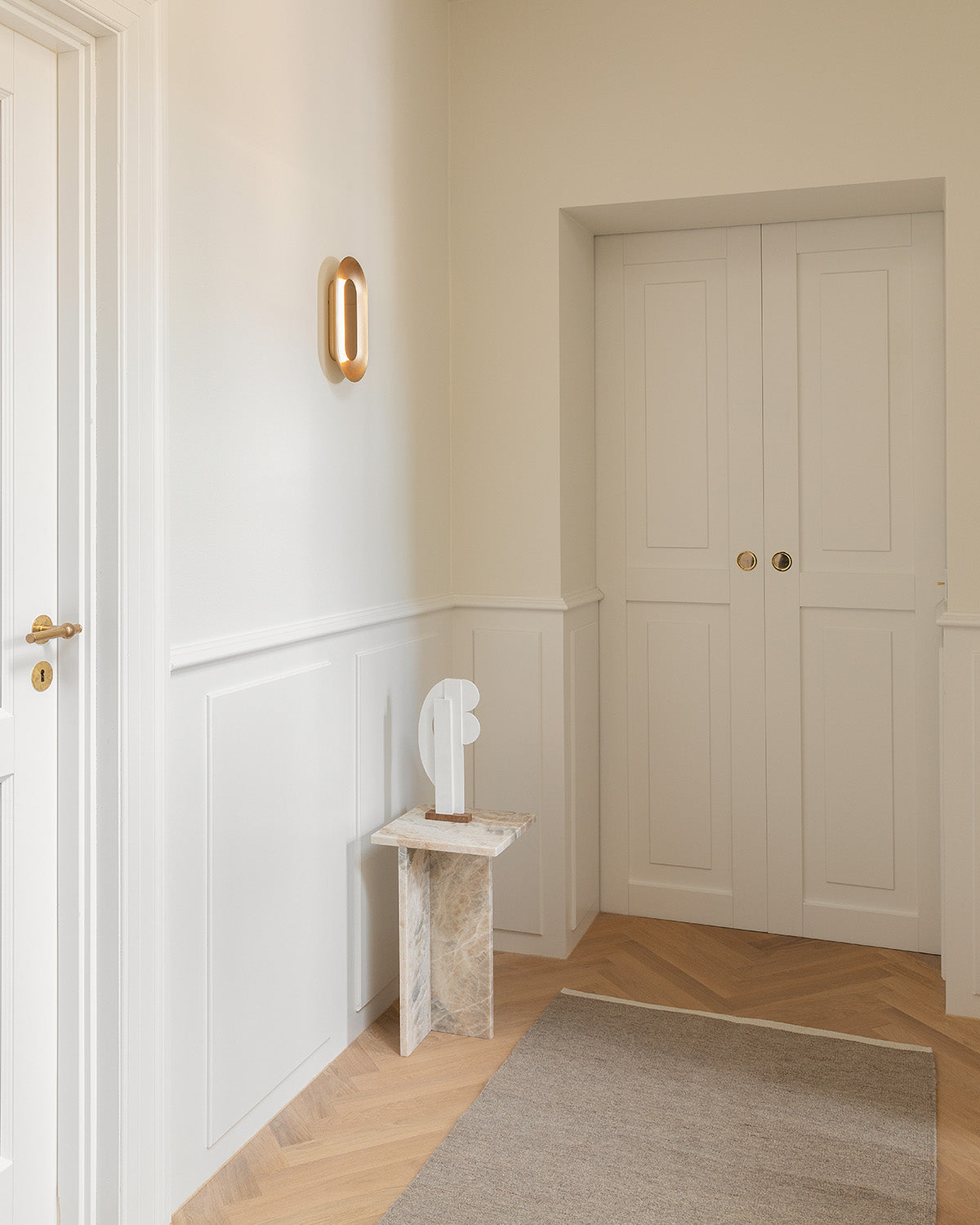 Sasi Small is a small designer wall lamp created in collaboration with Dutch Rick Tegelaar. A golden, oval aluminium shade in satin finish comprises the base, and a smaller shape in high-polished brass finish is placed at the centre. The glossy mirror effect creates subtle reflections and functions as a lampshade for the integrated LED module, spreading a discreet and indirect light. Use Sasi Small as a decorative wall lamp in the living room, stairway, and hall.