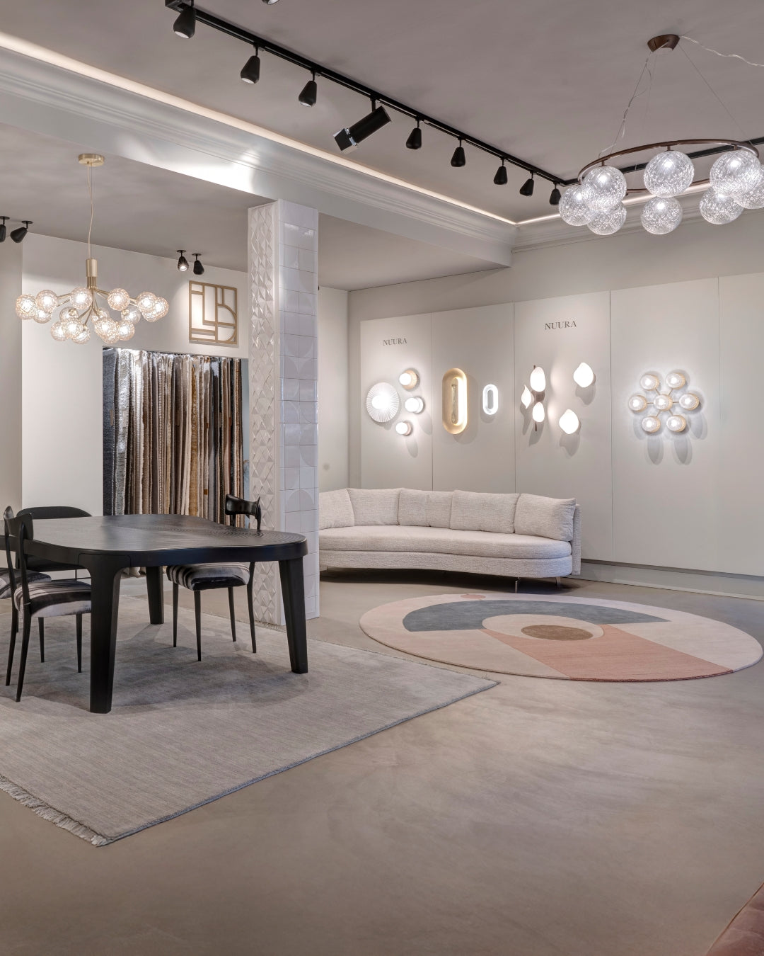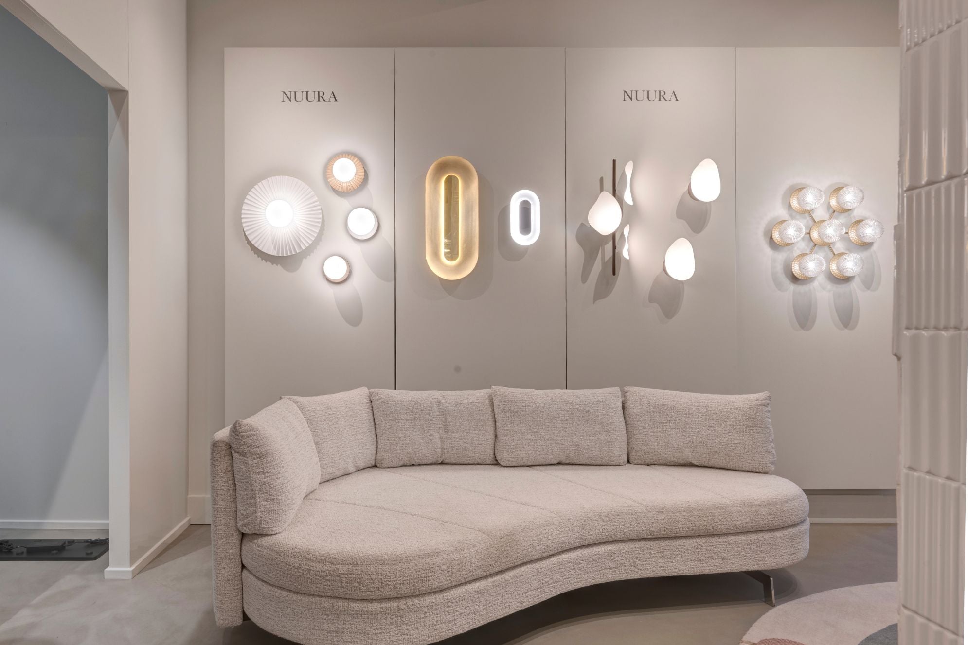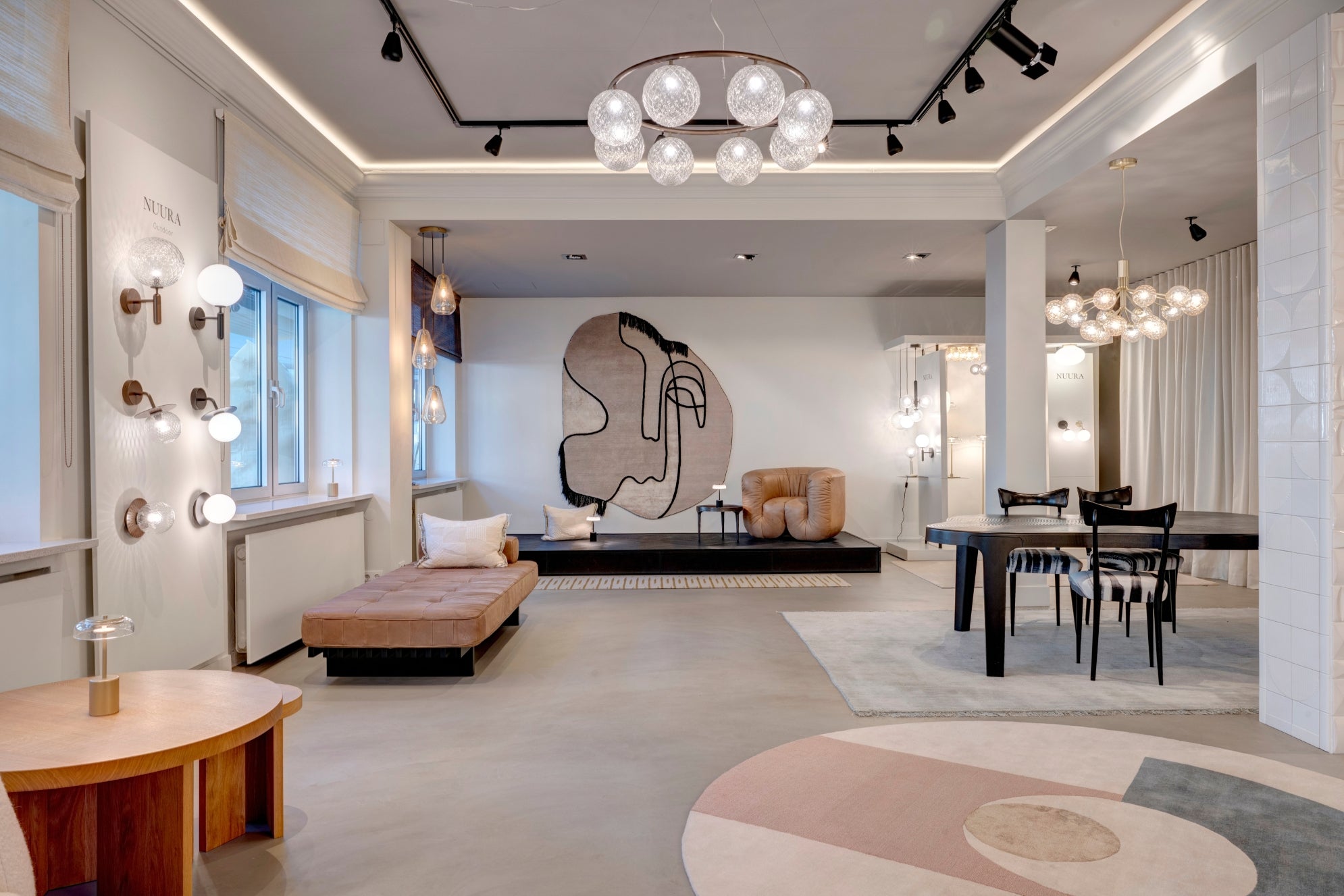 I München showroomet præsenteres lyset ikke alene, men som en del af et levende og helhedsorienteret miljø. Samspillet mellem naturligt dagslys, bløde tekstiler og taktile overflader fremhæver hver enkelt designs karakter og viser, hvordan Nuuras belysning former stemningen i rummet.
