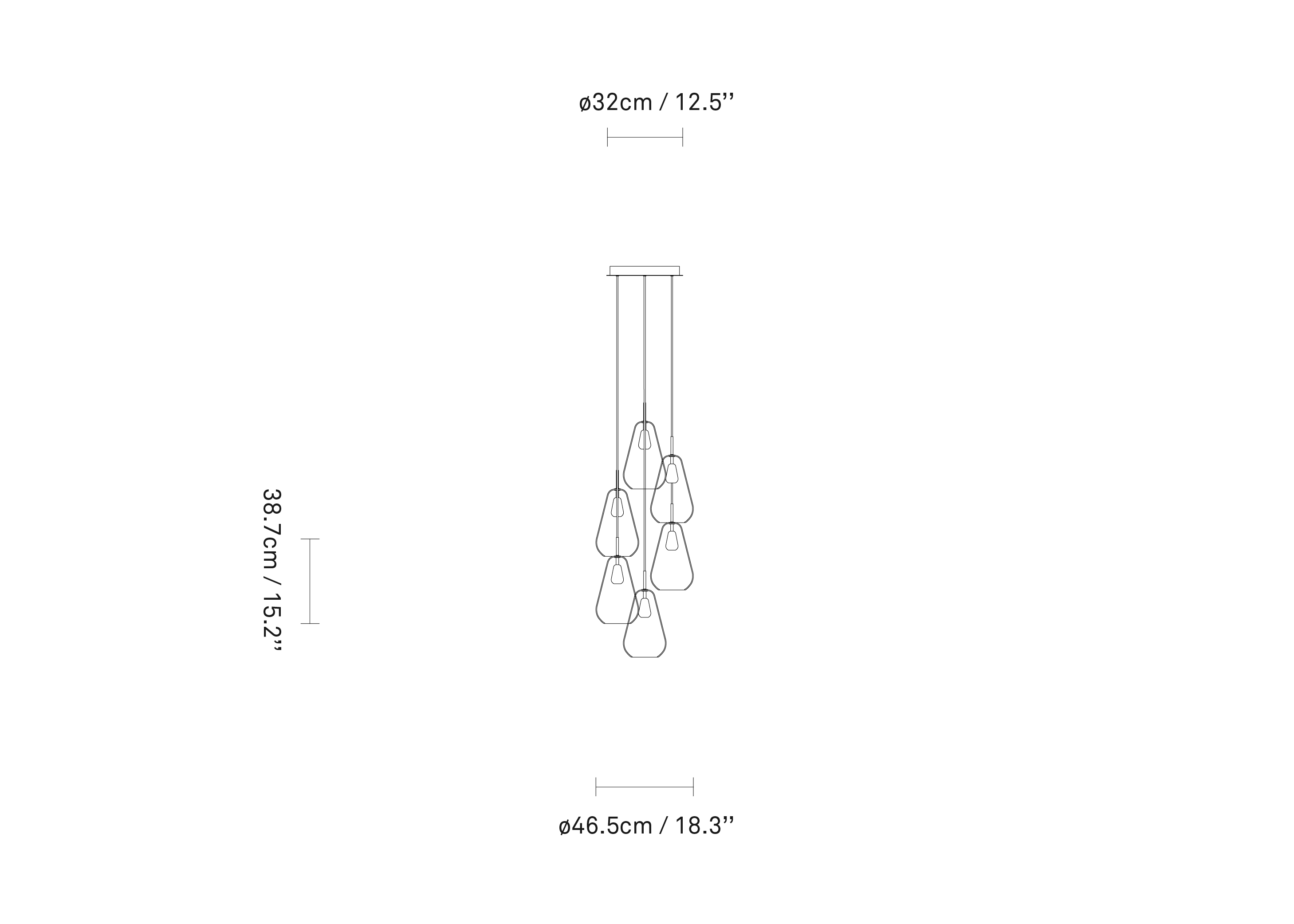 Anoli 6 er en stor lysekrone, inspireret af regndråber på en septemberdag. Anoli-lysekronen er designet som en klynge af lys, bestående af seks dråbeformede glaspendler. Glasskærmene er håndmalede med en speciel glans, som giver dem en varm, gylden tone. Skærmene suppleres af detaljer i gyldent metal, mens sorte stofledninger tilfører et diskret kontrastelement. Pendlernes klyngeformation giver et legende udtryk til en indretning, og klyngen egner sig godt i en stor hall eller trappeopgang, hvor dråberne falder fra loft mod gulv som en iøjnefaldende lysinstallation.