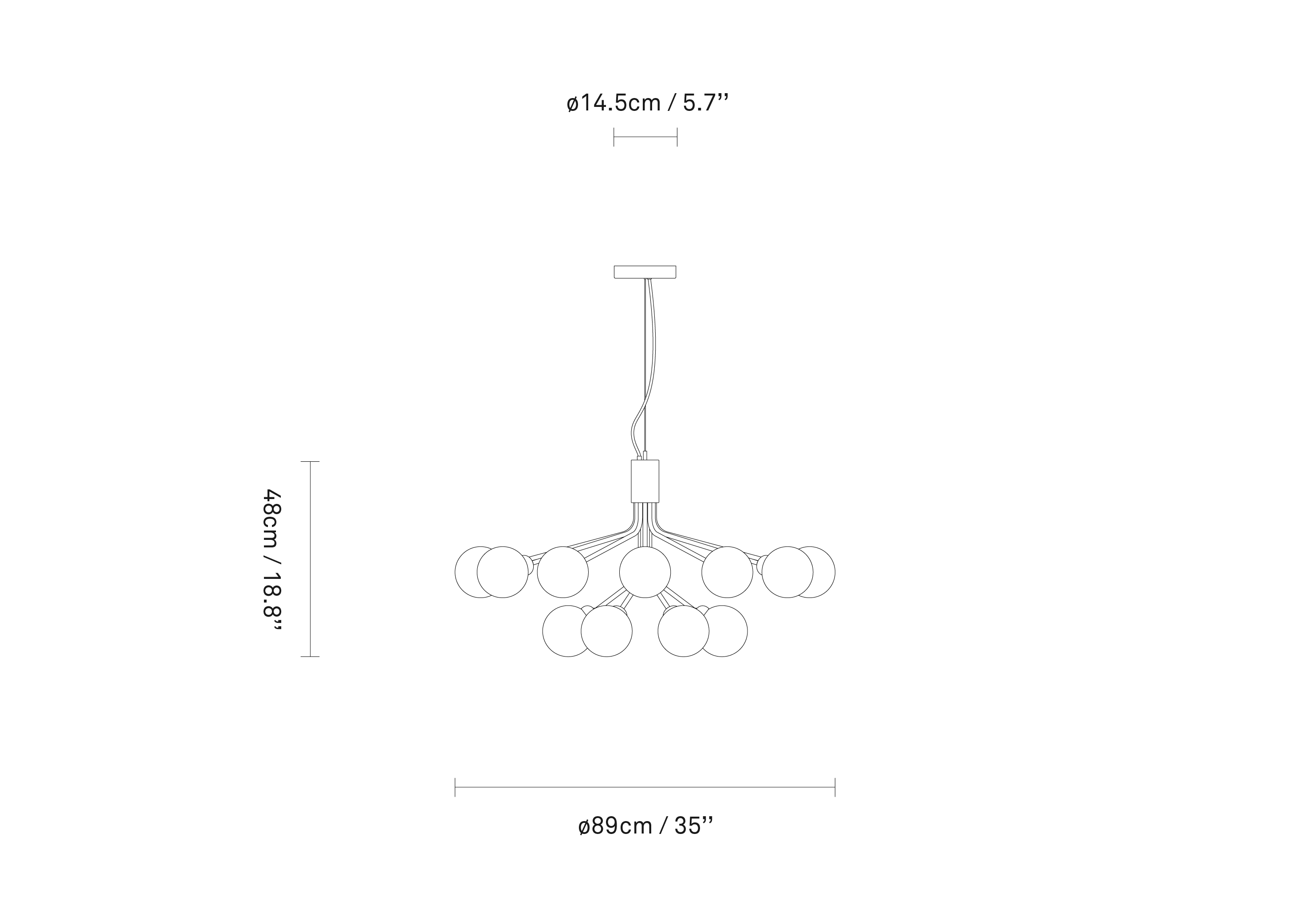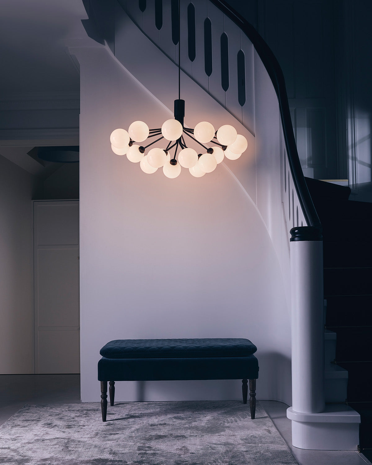 Apiales 18 er den største lysekrone i Apiales kollektionen. Lysekronen består af en specialproduceret metalkappe, hvorfra 18 metalarme, i satin black, holder de mundblæste glaskupler, som spreder et varmt og indbydende lys. Apiales 18 er ideel som centrepiece i foyeren, den store stue eller ved det store spisebord.