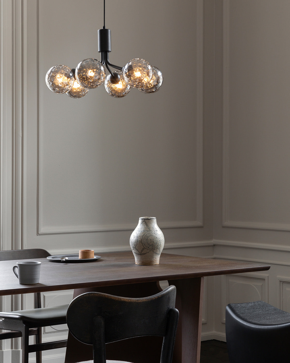 Apiales 6 er en kombination af den klassiske lysekrone og de enkle pendler fra Apiales kollektionen. De børstede messingarme munder ud i opale glaskugler, der spreder et varmt og indbydende lys. Apiales 6 egner sig godt til spisestuen, over køkkenøen eller soveværelset, hvor man ønsker en tidløs lysekrone.