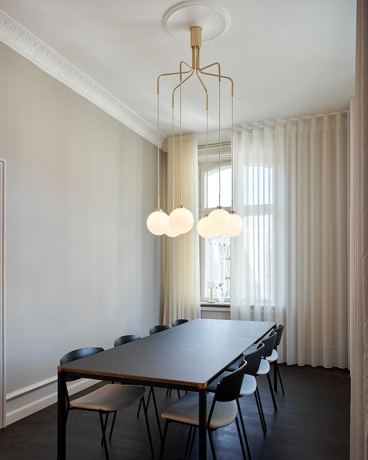 Apiales Cluster 6 er en klyngelysekrone som tilføjer volumen og et moderne udtryk til rummet. Lysekronen er designet med mundblæste, opale glaskugler, der hænger ned fra 6 solide metalstænger i et satin black finish og kræver en vis højde til loftet. Den smalle baldakin kan nemt monteres på en stuk, da den ikke skjuler loftets detaljer og formationen kan, på de forskellige pendler, justeres i forskellige højder.