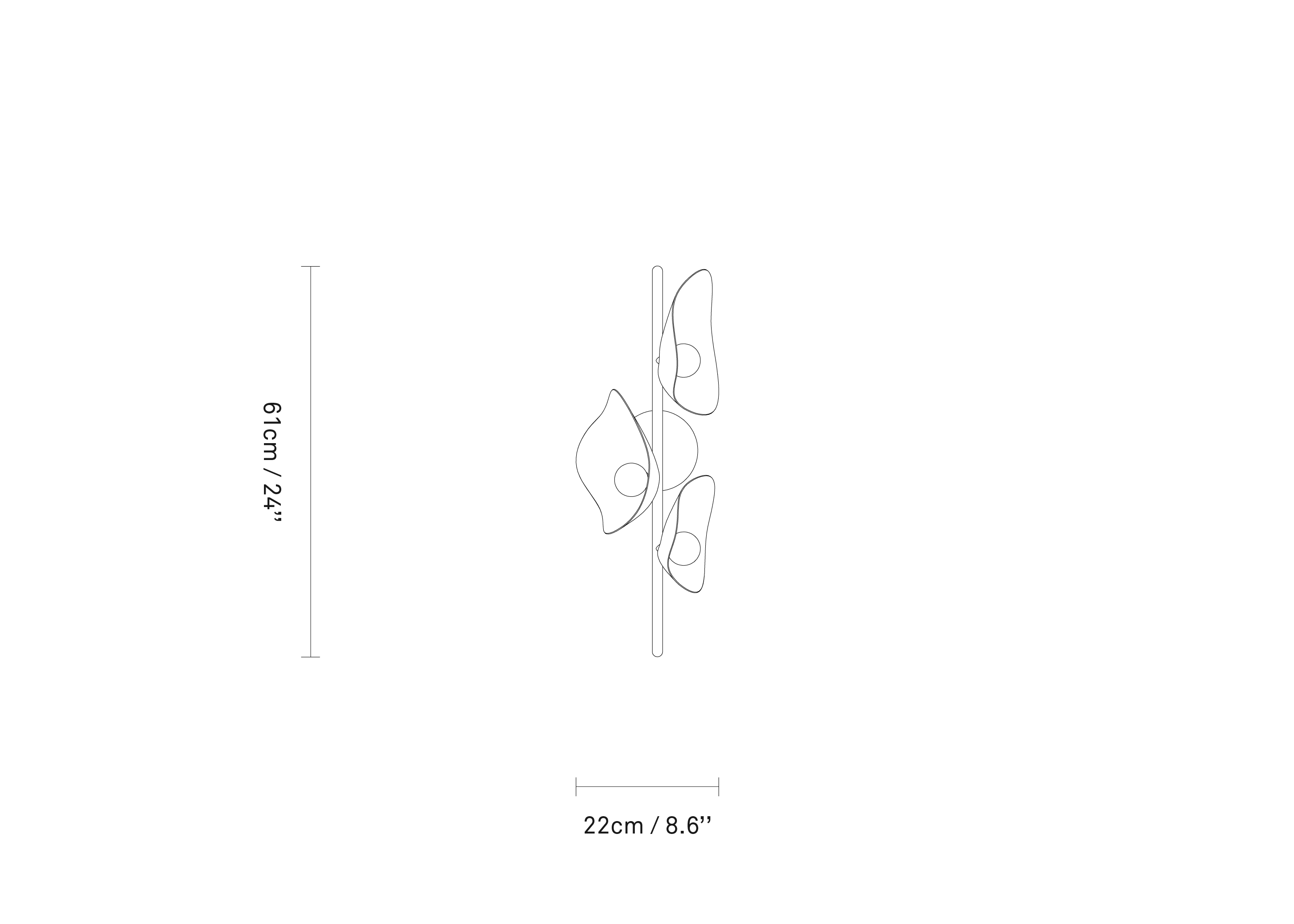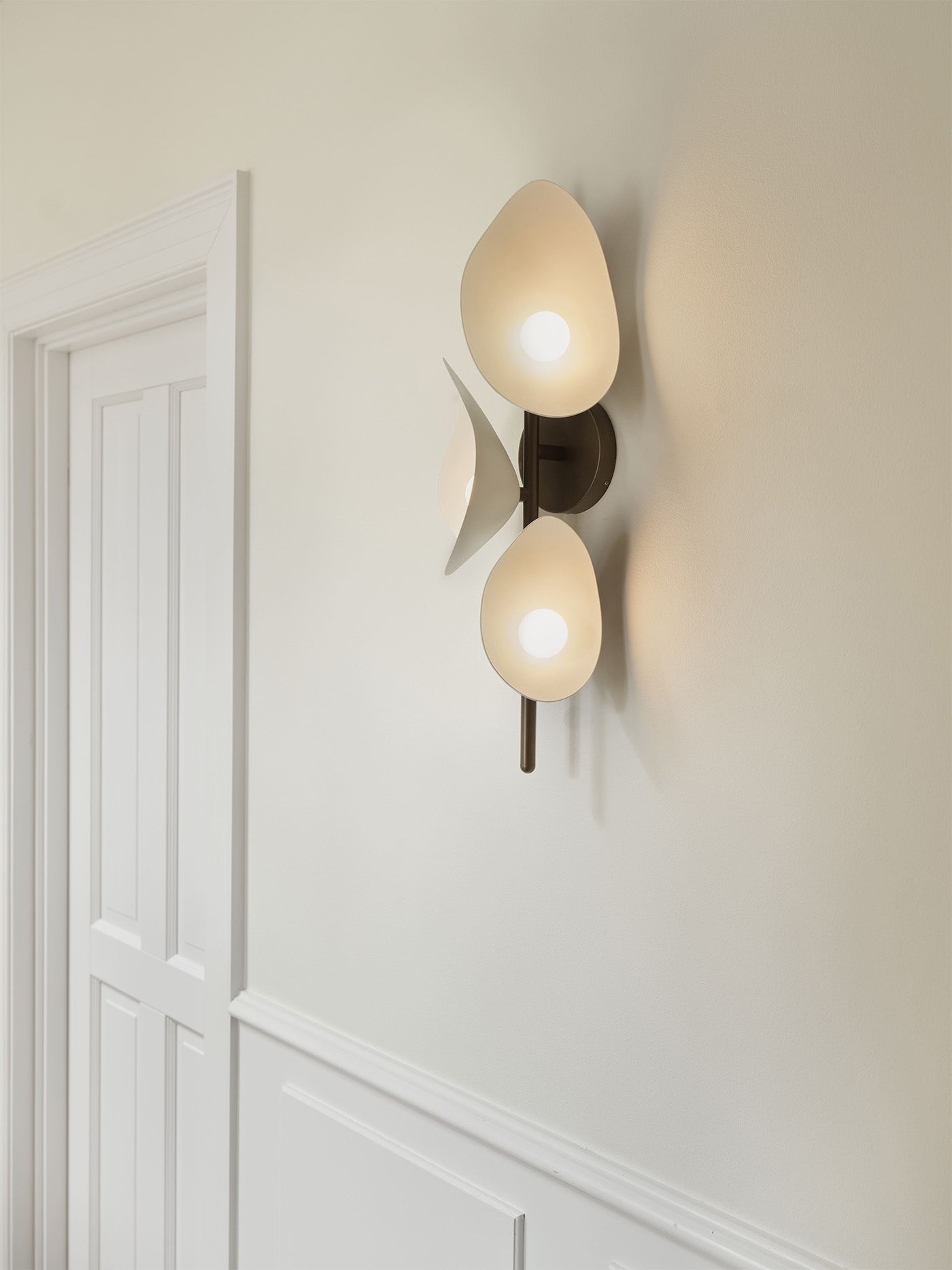 Florii 3 Wall er en aflang væglampe, der har et betagende formsprog . Den lineær metalstang i dark bronze, give en dyb kontrast til de hvide skærme i translucent polykarbonat, der udspringer med en varm og indbydende glød. Florii 3 Wall’s skulpturelle udtryk egner sig godt til halls og badeværelset, hvor den indrammer spejlet med sin yndefulde tilstedeværelse og med det integrerede LED, der giver effektiv og langtidsholdbar belysning, der nemt kan udskiftes uden værktøj.